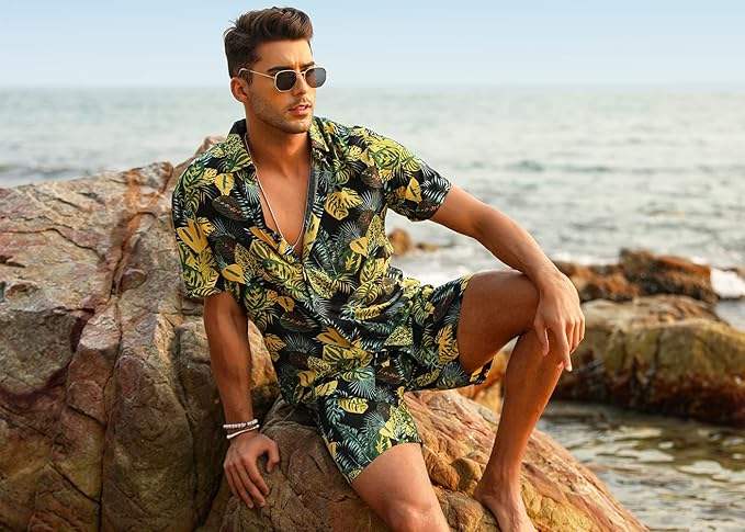 ชุดกีฬาฤดูร้อนลำลองสไตล์ฮาวายสำหรับผู้ชาย เสื้อโปโลซิปสั้น ระบายอากาศได้ดี สวมใส่สบาย พร้อมกางเกงขาสั้น