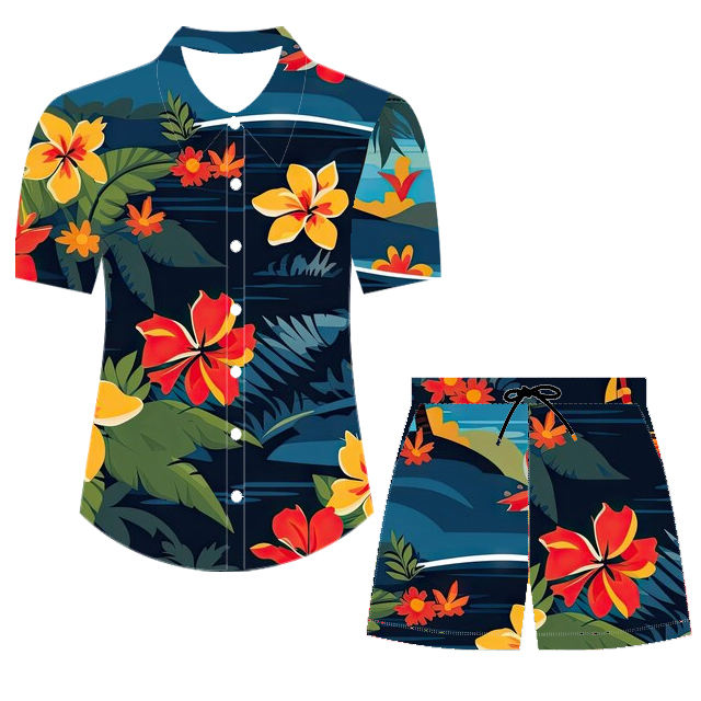 เสื้อเชิ้ตชายหาดฮาวายสีทึบระบายอากาศของผู้ชายชุดสั้นพิมพ์ลายดอกไม้ดิจิทัลพิมพ์ซับลิเมชันและหน้าจอ DTF DTG