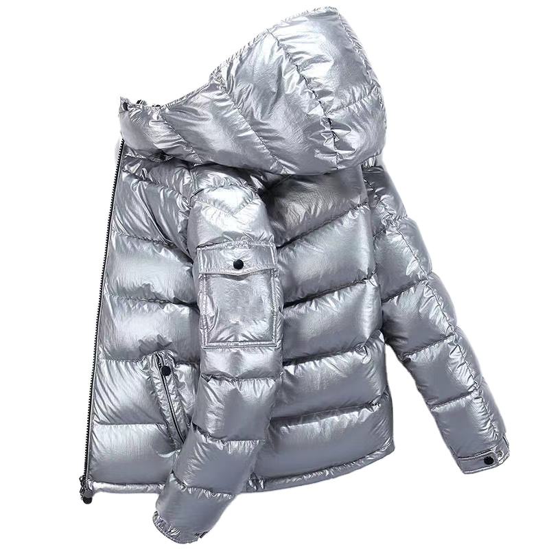 เสื้อแจ็คเก็ตบอมเบอร์ผู้ชายแบบหนา มีฮู้ด ทรงสั้น เงา แฟชั่นหน้าหนาว ปี 2025