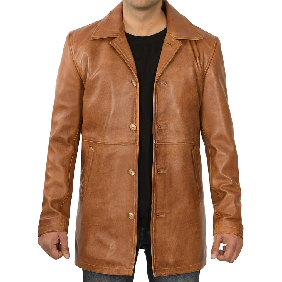 แจ็คเก็ตหนังสีน้ำตาลคลาสสิกสำหรับผู้ชาย แบบยาว ปิดด้วยกระดุม เหมาะสำหรับใส่ในฤดูหนาว คุณภาพพรีเมียม ดีไซน์ทันสมัย สามารถปรับแต่งได้