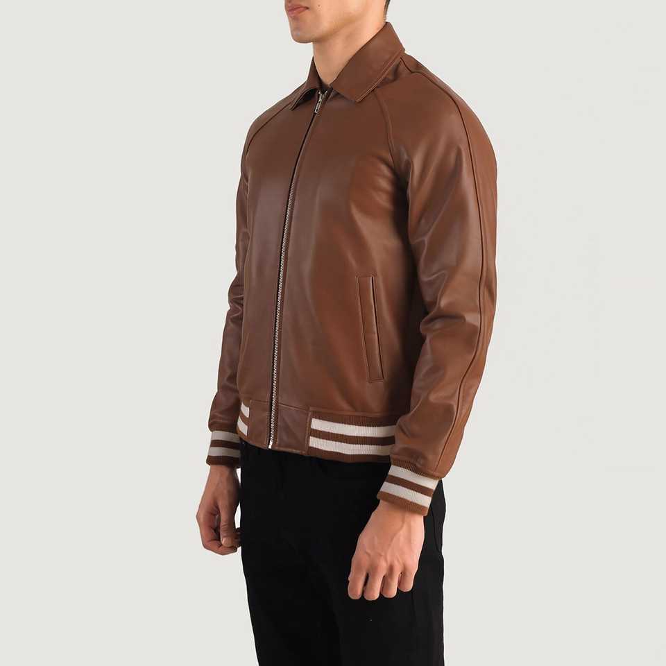 Men's Brown Cow Skin Leather Bomber Jacket with Striped Cuffs Stylish & Comfortable Stand Collar Outerwear with Front Logo