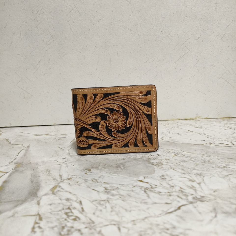 กระเป๋าสตางค์หนังแท้ขนวัวสีน้ำตาลสไตล์วินเทจของผู้ชายมีซิปยาวดีไซน์ดอกไม้กันขโมยคุณสมบัติของเครื่องมือ