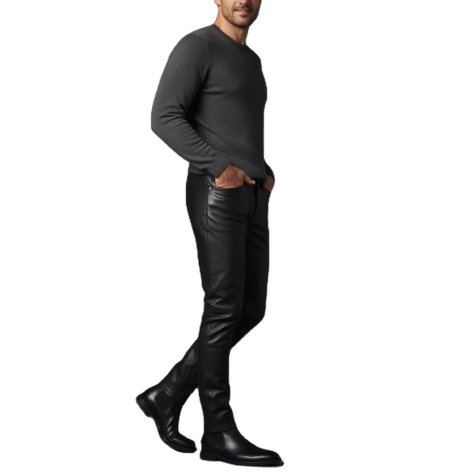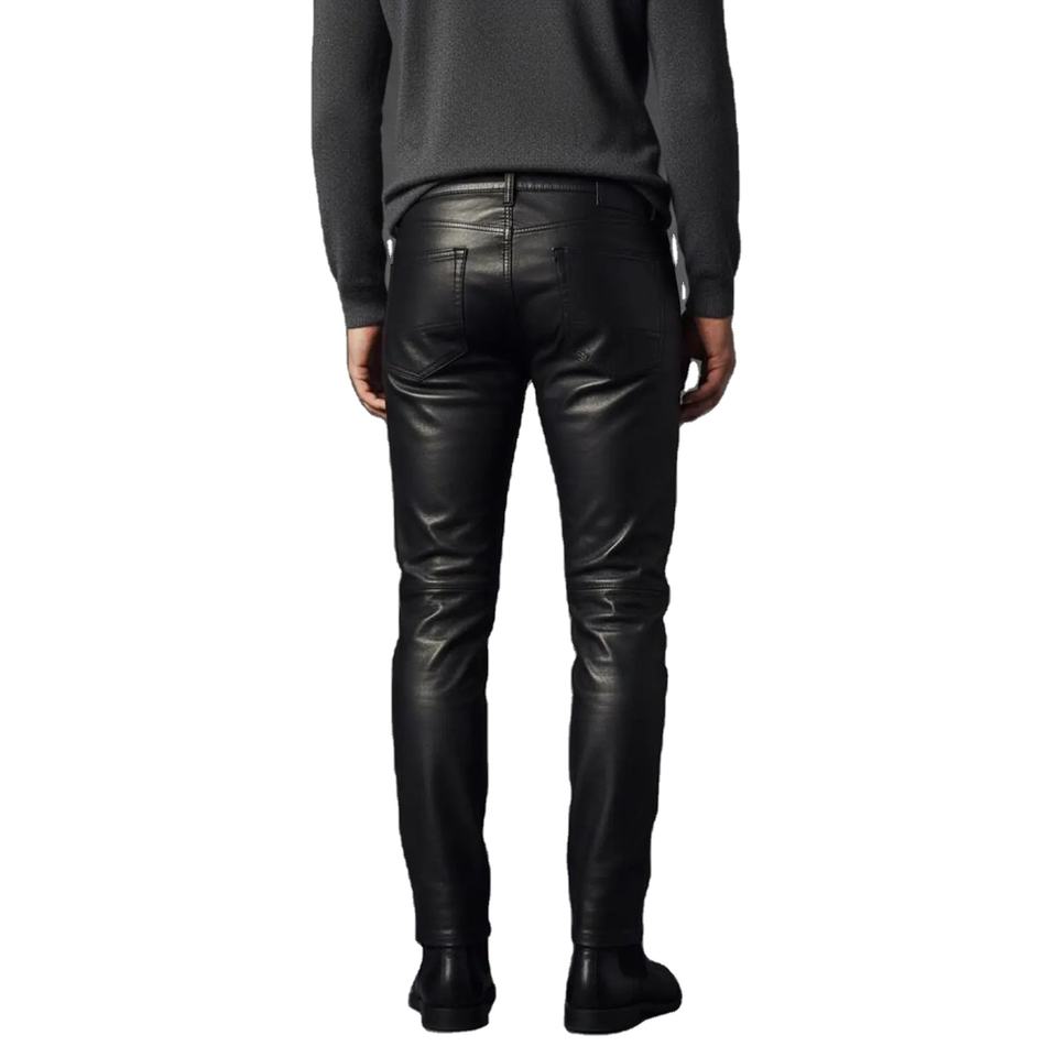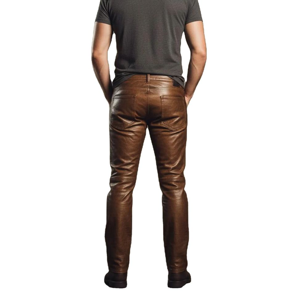 กางเกงหนังแกะสีน้ำตาลสำหรับผู้ชาย ผิวเคลือบแว็กซ์แบบดิสเทรส กางเกงหนังแกะสีดำทรงสลิมฟิต กางเกงหนังแท้