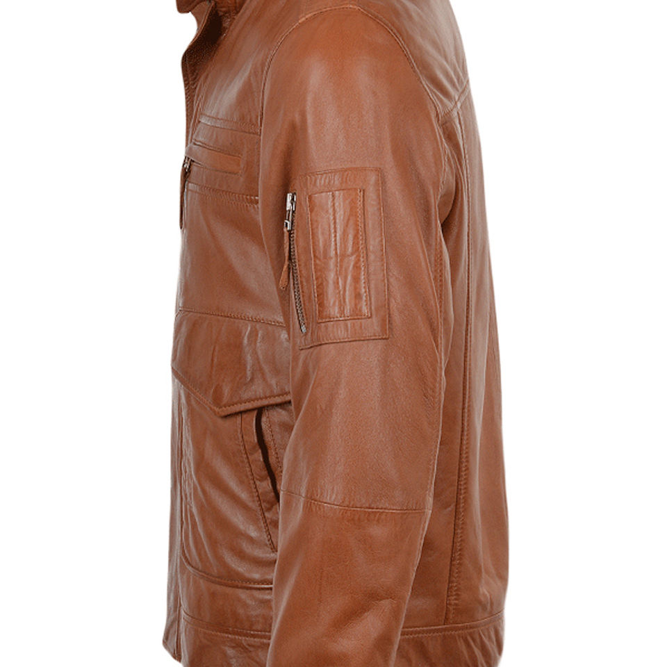 เสื้อแจ็คเก็ตหนังสีน้ำตาลสำหรับผู้ชาย พร้อมกระเป๋าแบบแปะและปกถัก ผลิตตามสั่งโดยบริษัทไมคา