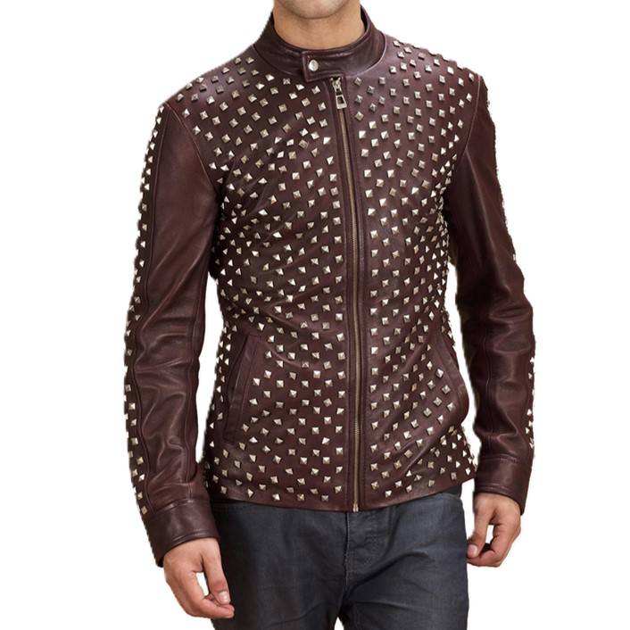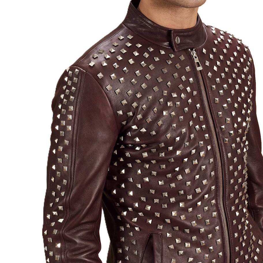 แจ็คเก็ตหนังสีน้ำตาลสำหรับผู้ชาย สไตล์พังก์ร็อก ไบค์เกอร์ ประดับหมุดโลหะ ดีไซน์ทรงเข้ารูป พร้อมซิปด้านหน้า