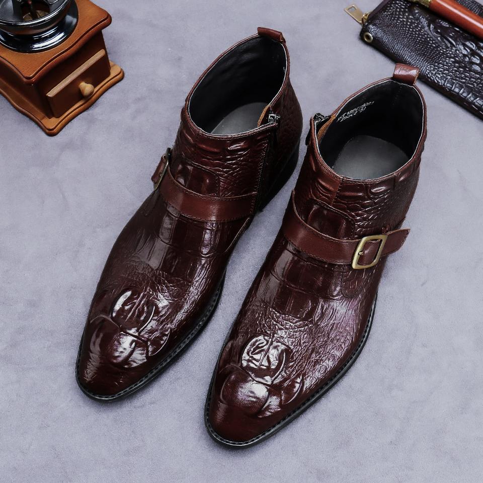 Men's Buckle Design Ankle Boots New Winter Style Genuine Leather Handmade Pointed Dress Boots
