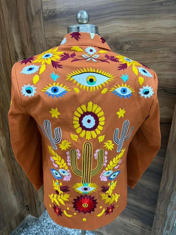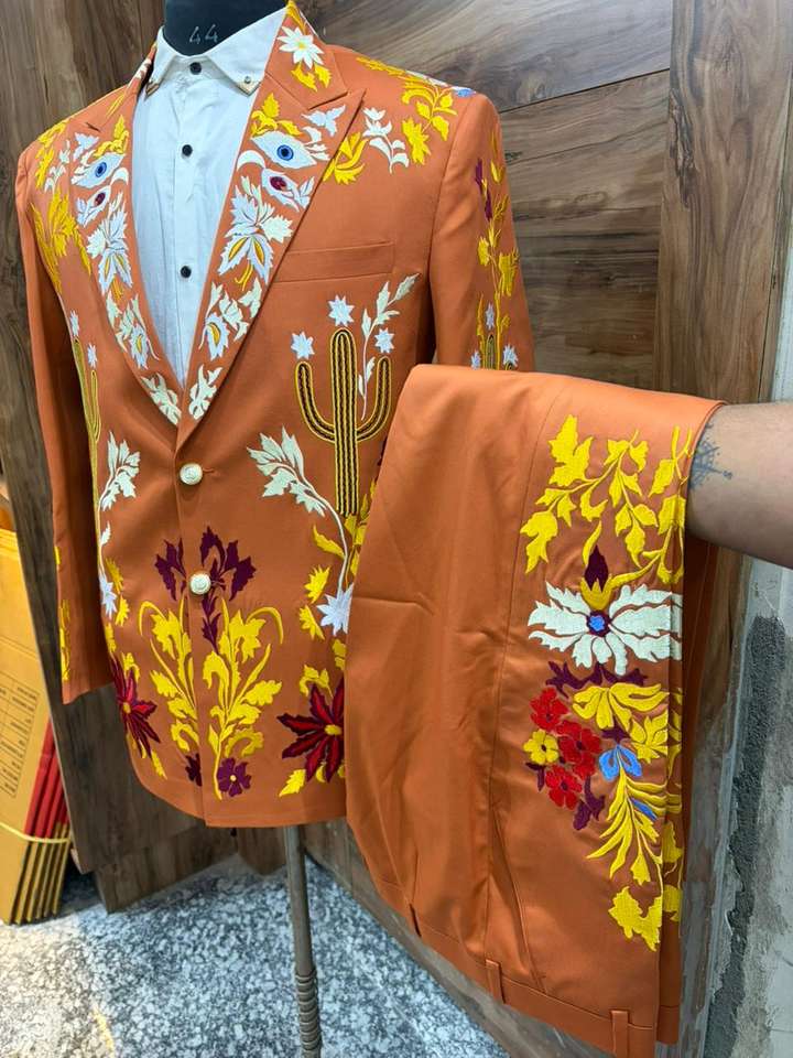 ชุดสูทปักลายสีส้มไหม้สำหรับผู้ชาย – เสื้อเบลเซอร์ลายดอกไม้สไตล์ตะวันตกแบบสั่งทำพร้อมกางเกงเข้าชุด – ชุดสำหรับงานแต่งงาน งานพรอม และการแสดงบนเวที