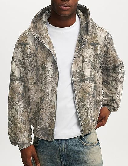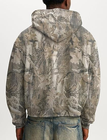 เสื้อฮู้ดซิปผู้ชายลายพราง โอเวอร์ไซส์ ผ้าฟลีซ ลายใบไม้พรางตัว เสื้อกันหนาวมีฮู้ดสำหรับฤดูใบไม้ร่วง