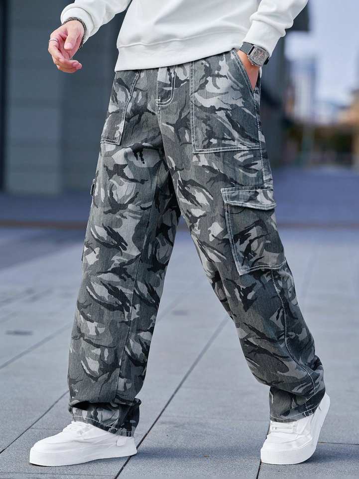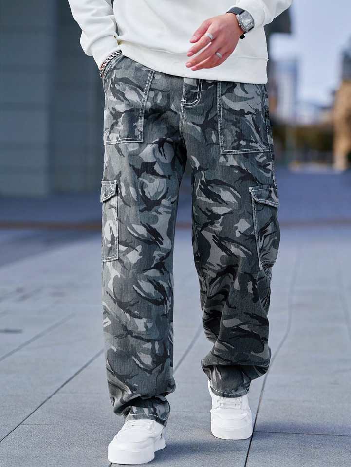 กางเกงคาร์โก้ขายาวแบบลำลองลายพรางสำหรับผู้ชายกางเกงคาร์โก้ขากว้างทรงหลวมดีไซน์ย้อนยุค