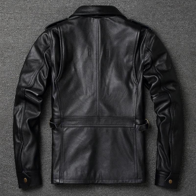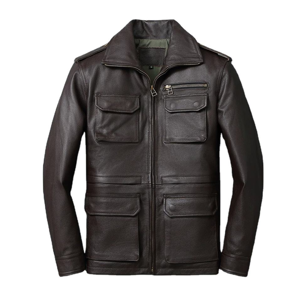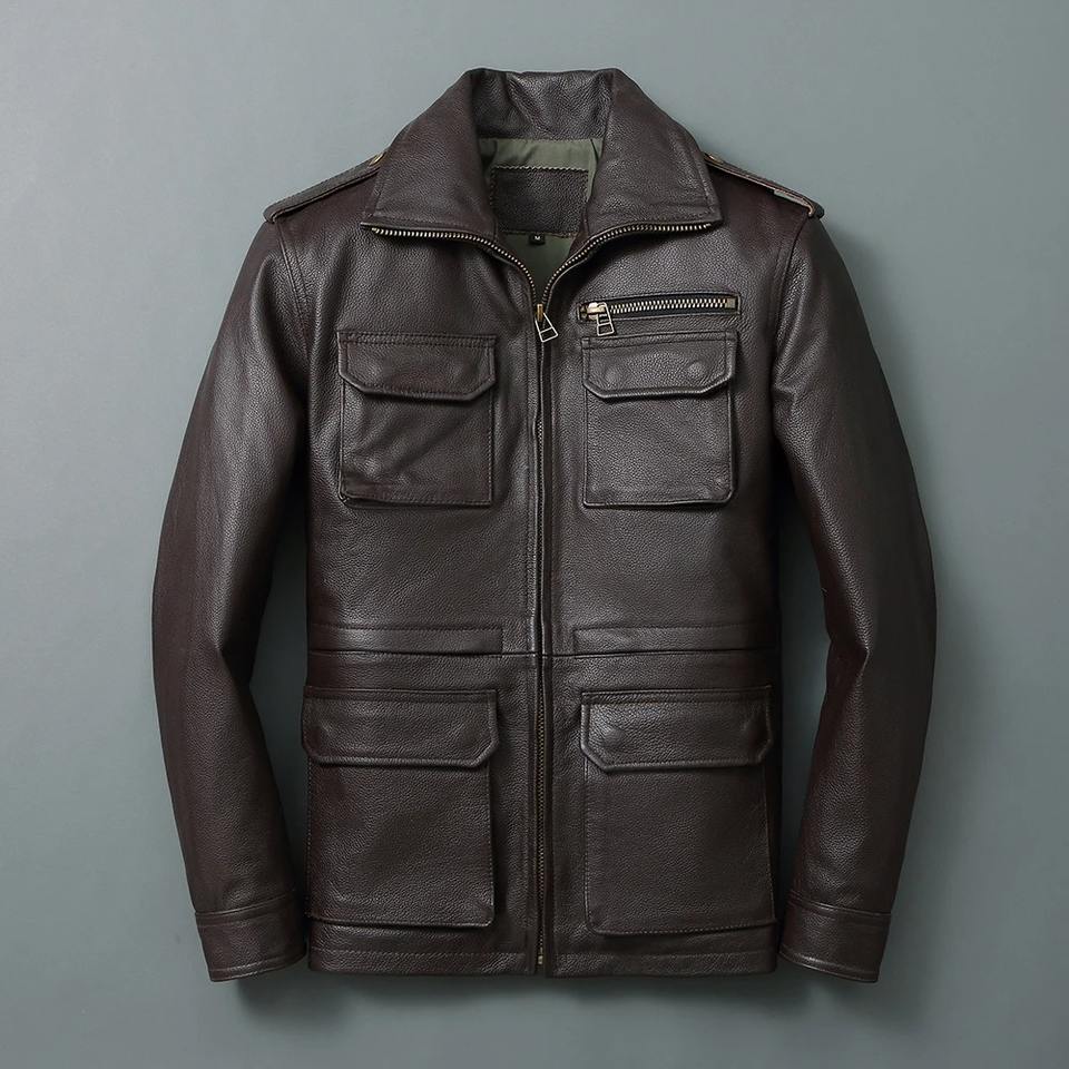 เสื้อแจ็คเก็ตผ้าใบหนังแท้สำหรับผู้ชายกระเป๋าหลายใบสไตล์สตรีทสุดคลาสสิคสีน้ำตาล