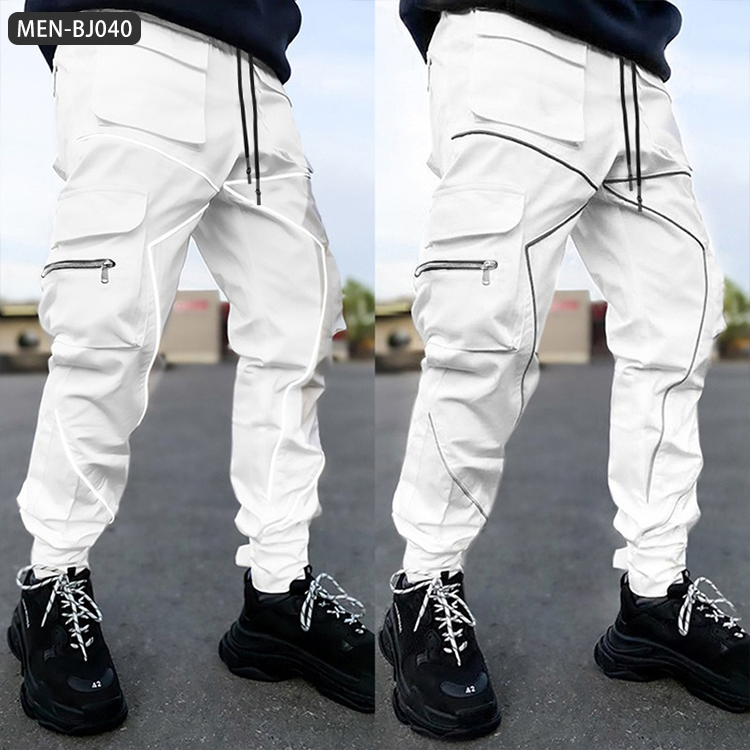 กางเกงคาร์โก้ของผู้ชายกางเกงทำงานสะท้อนแสงมีกระเป๋าทรงโอเวอร์ไซส์กางเกงแนวสตรีทฮิปฮอป