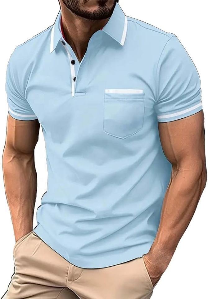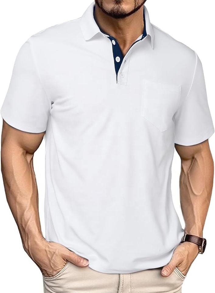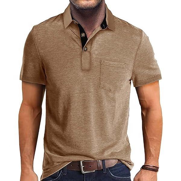 เสื้อโปโลผู้ชายลำลอง ผ้าฝ้าย 100% มีกระเป๋า แขนสั้น ผ้าถักกันยับ ลายเรียบ โลโก้ด้านหน้า