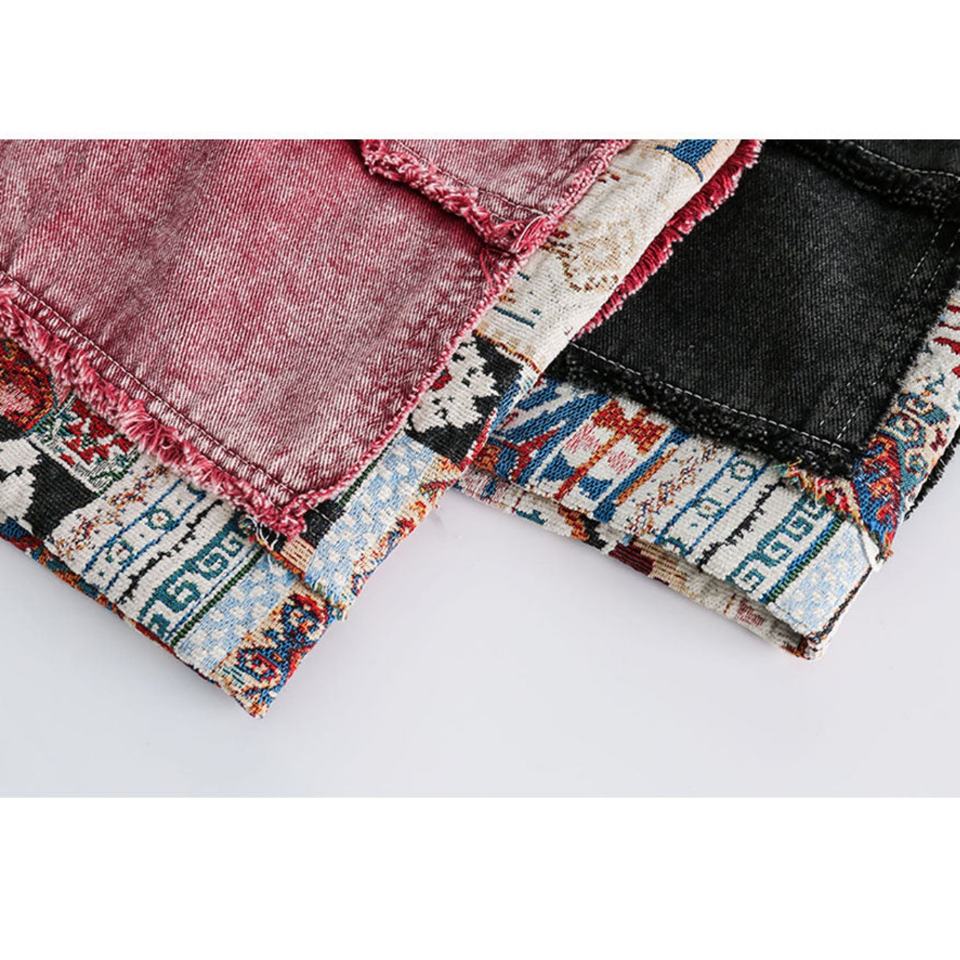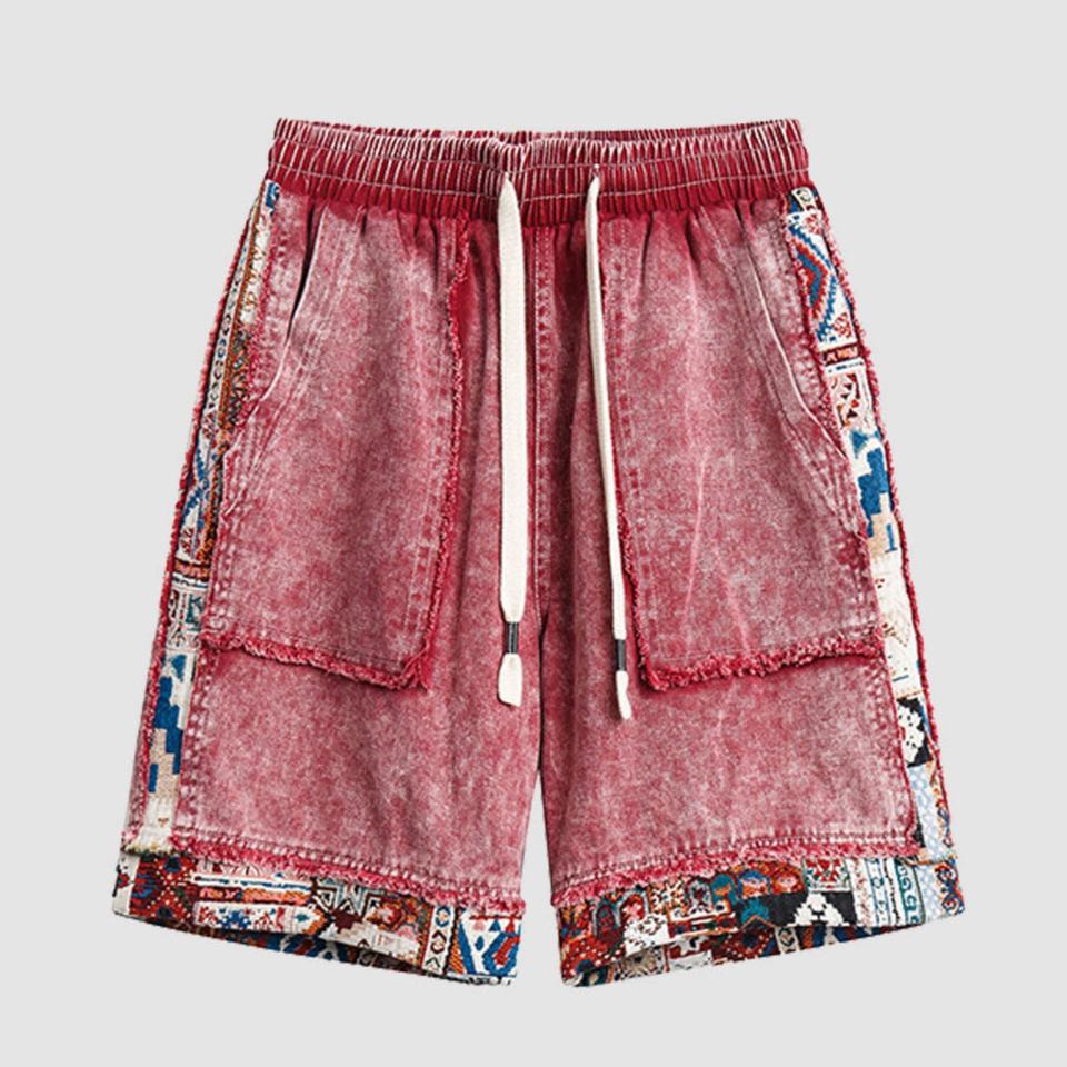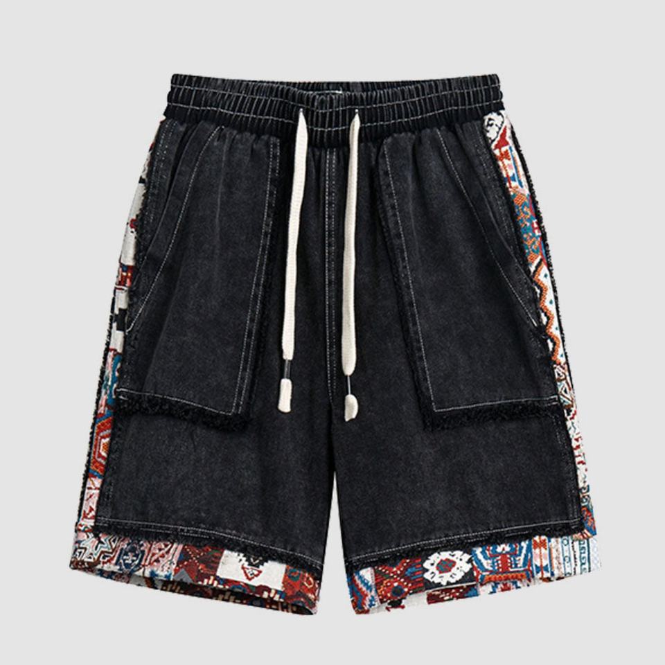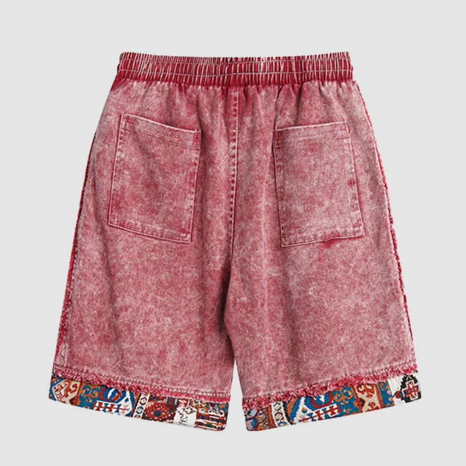 กางเกงขาสั้นลำลองผู้ชาย ผ้าฝ้าย 100% เอวกลาง สไตล์ชาติพันธุ์ ล้างสีแบบวินเทจ แต่งพู่ ผ้าเดนิม ปะติดปะต่อ มีเชือกผูก