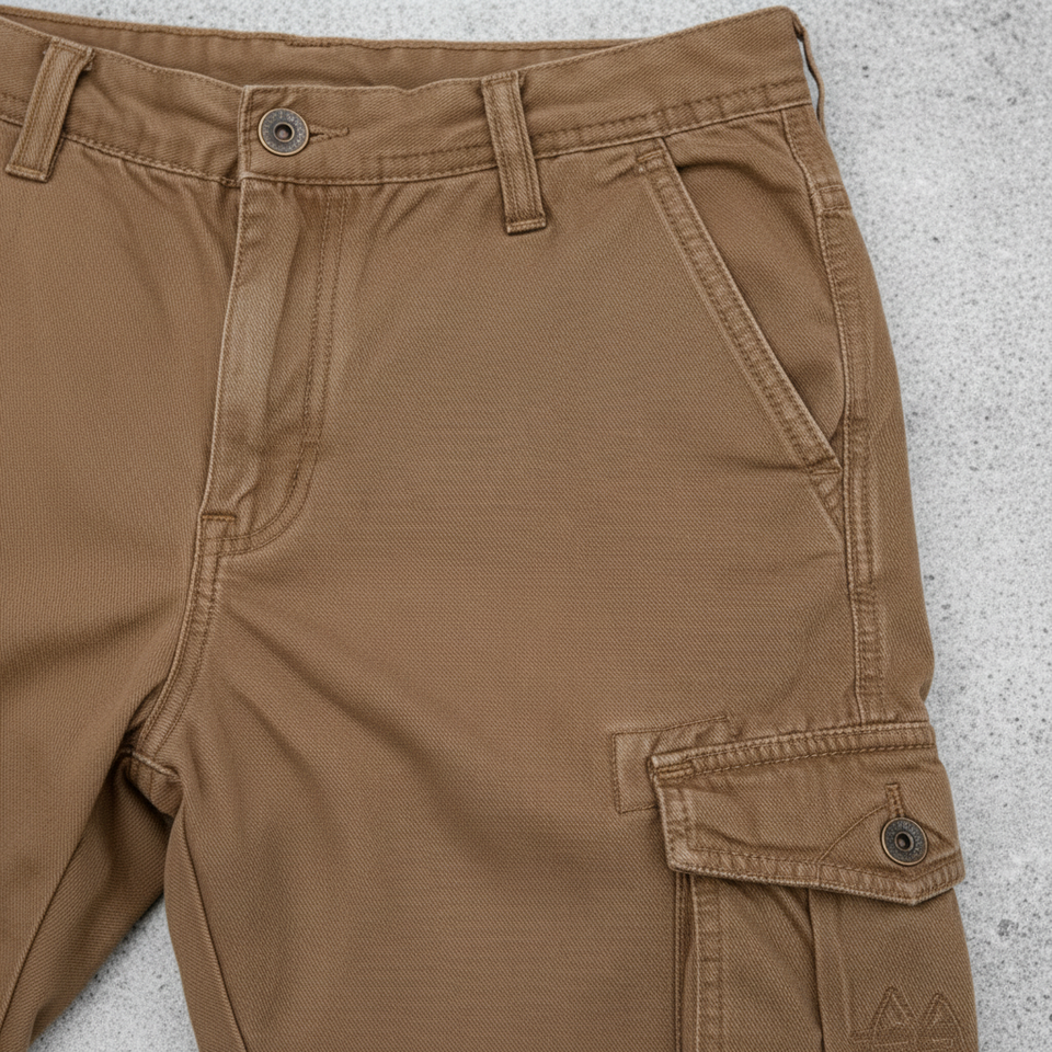 กางเกงขาสั้นคาร์โก้สีน้ำตาลสำหรับผู้ชาย เอวยางยืด ทรงกลาง เอวสูงปานกลาง มีกระเป๋าหลายช่อง ผ้าแคนวาสทนทาน ป้องกันรังสียูวี เหมาะสำหรับใส่ทำงานกลางแจ้งในฤดูร้อน