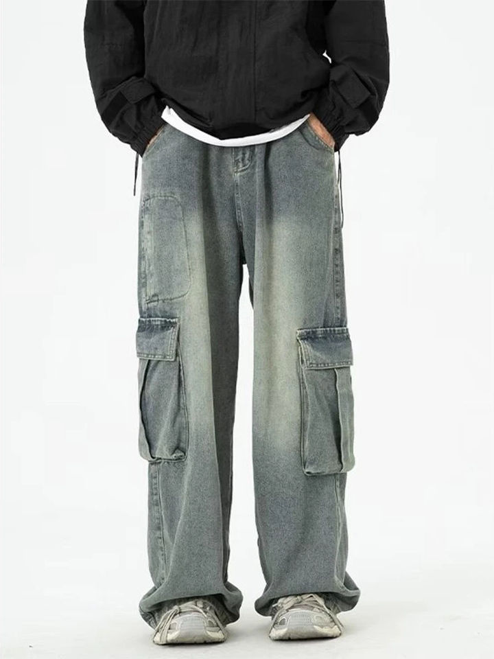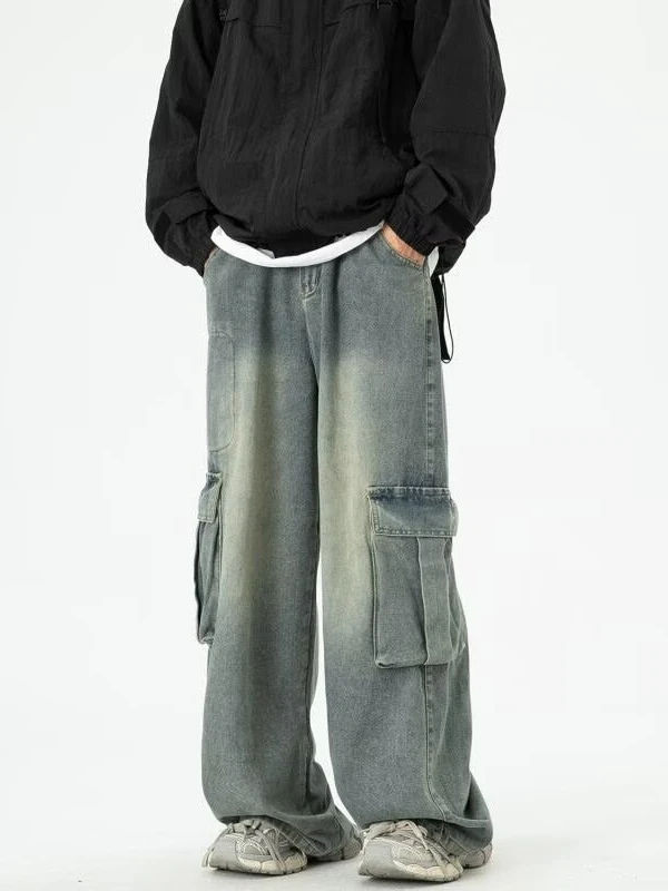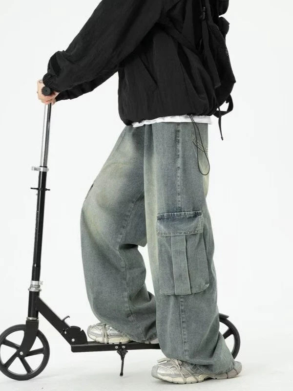 กางเกงยีนส์คาร์โก้ลำลองผู้ชาย ผ้าเดนิมน้ำหนักมาก ทรงปกติ คุณภาพสูง สไตล์อเมริกันเรโทร ทรงตรงแบบใหม่