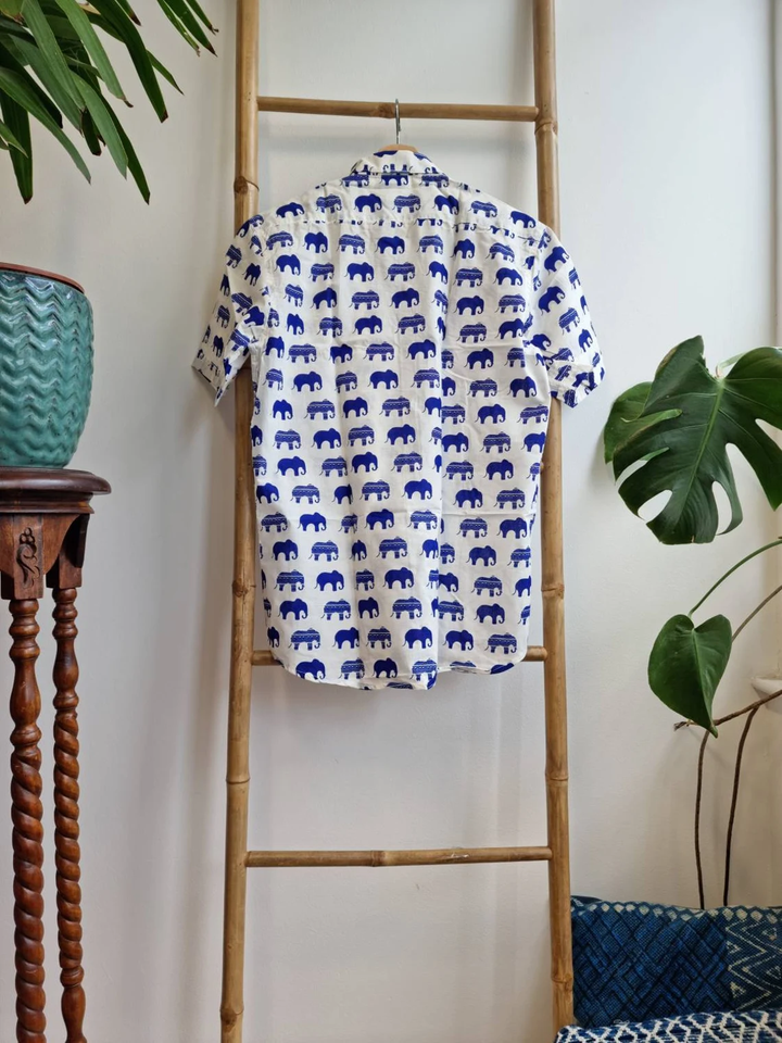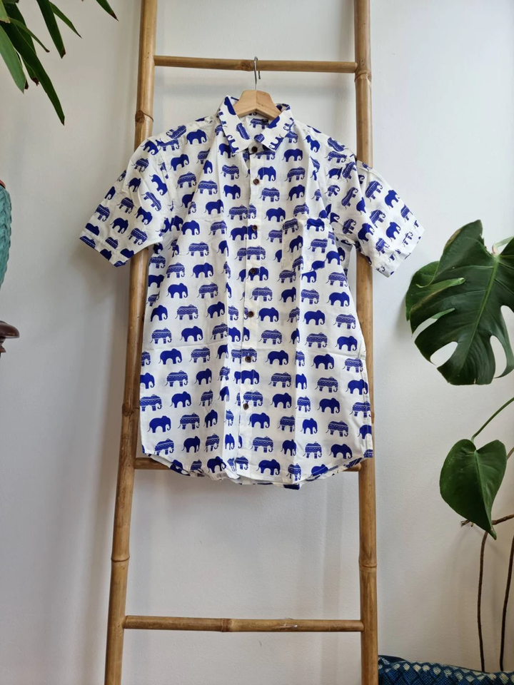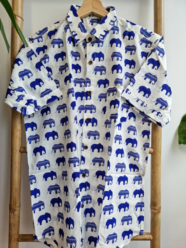 เสื้อเชิ๊ตผู้ชายผ้าคอตตอนพิมพ์มือสไตล์อินเดียสำหรับฤดูร้อนพิมพ์ลายเท่และใส่สบายสำหรับปิกนิกในสวนชายหาด