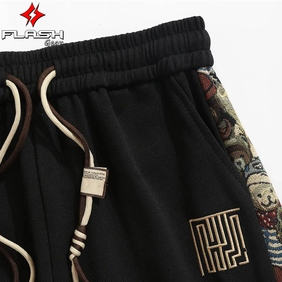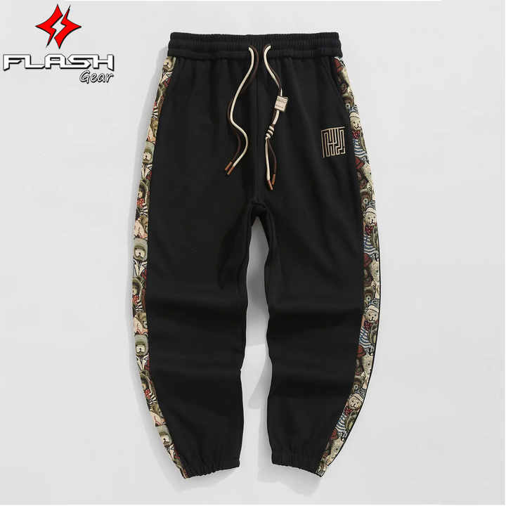 Men's Casual Embroidery Cartoon Animal Bear Print Contrast Trim Spliced Bicolor Drawstring Jogger Sweatpants Black