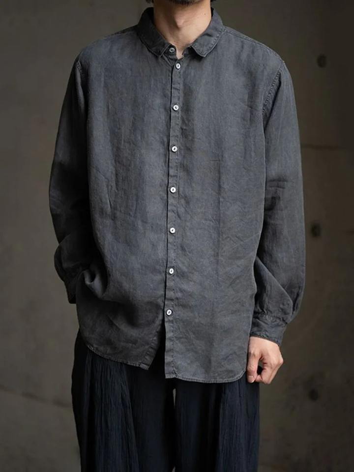 เสื้อเชิ้ตผู้ชายแขนยาวสีเทา ผ้าลินิน 100% ทรงโอเวอร์ไซส์ ลุคสบายๆ ดีไซน์ทันสมัย ทรงเข้ารูป เหมาะสำหรับใส่ลำลอง