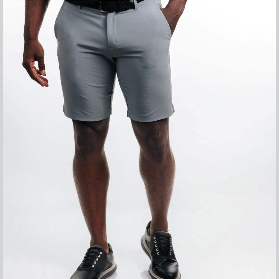 กางเกงขาสั้นผ้าโพลีเอสเตอร์แห้งเร็วสำหรับผู้ชายใส่เล่นกอล์ฟแบบลำลองมีกระเป๋าผ้ายืดสีทึบพิมพ์โลโก้ได้ตามต้องการ