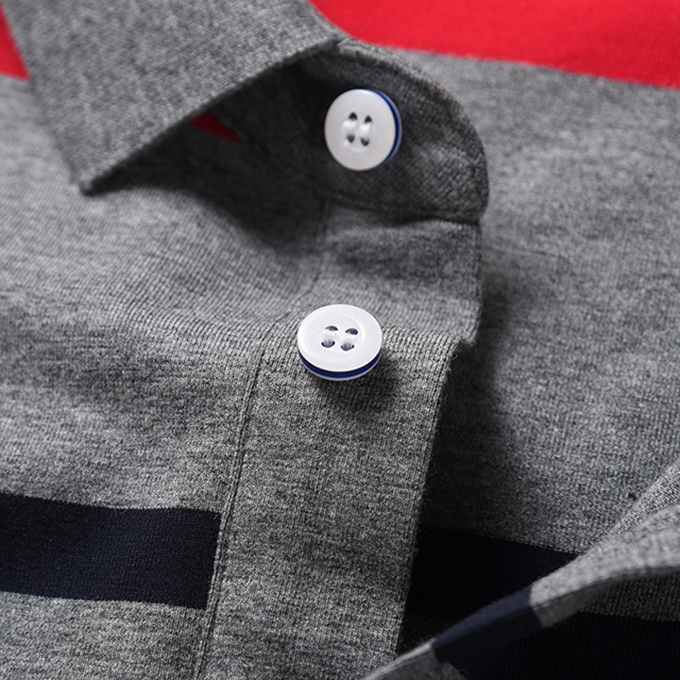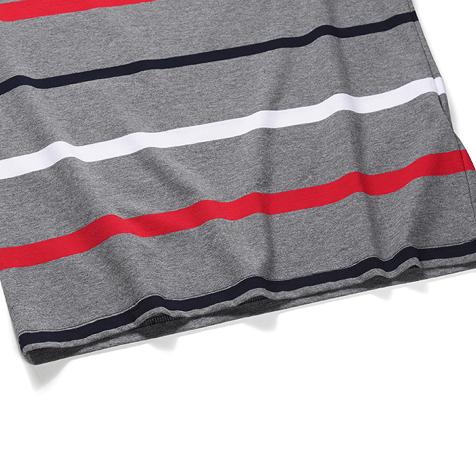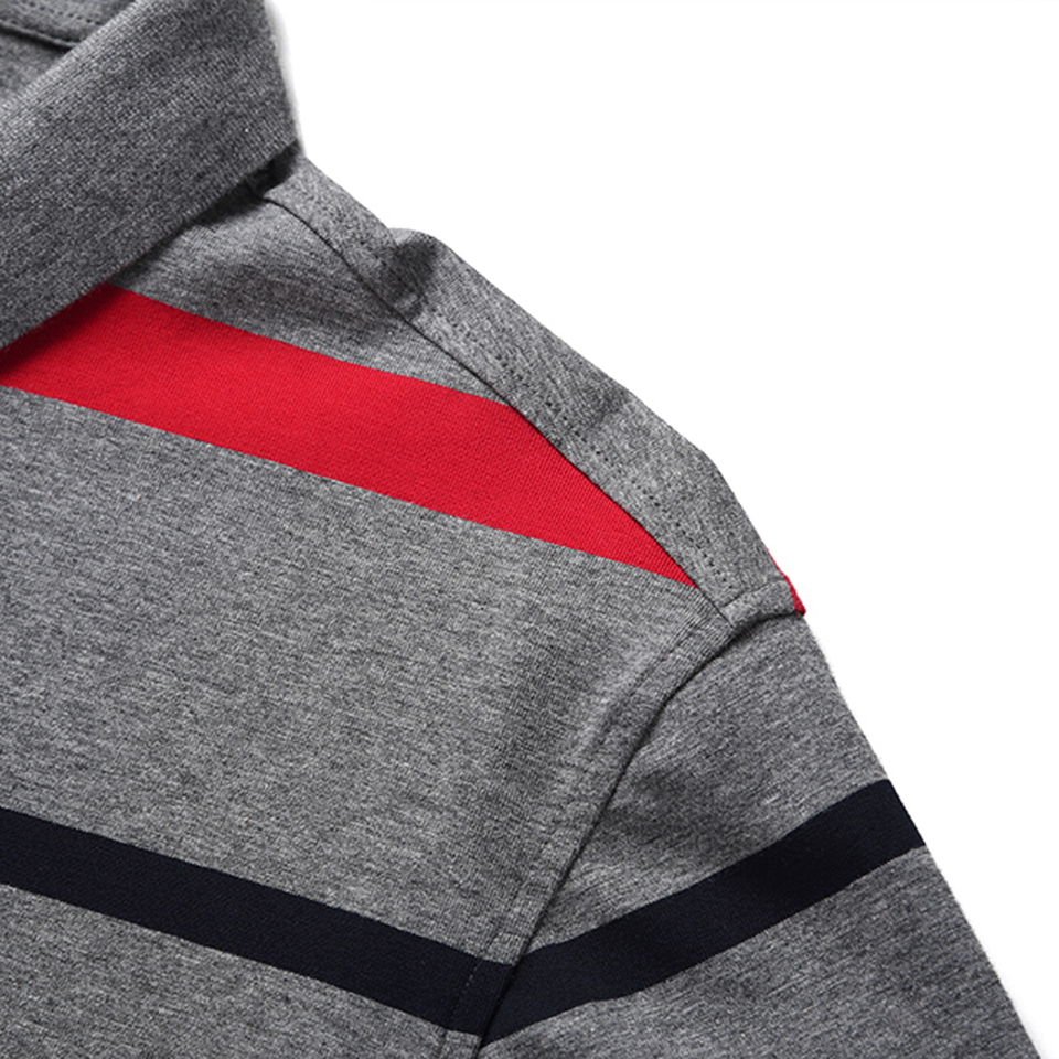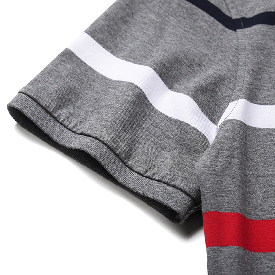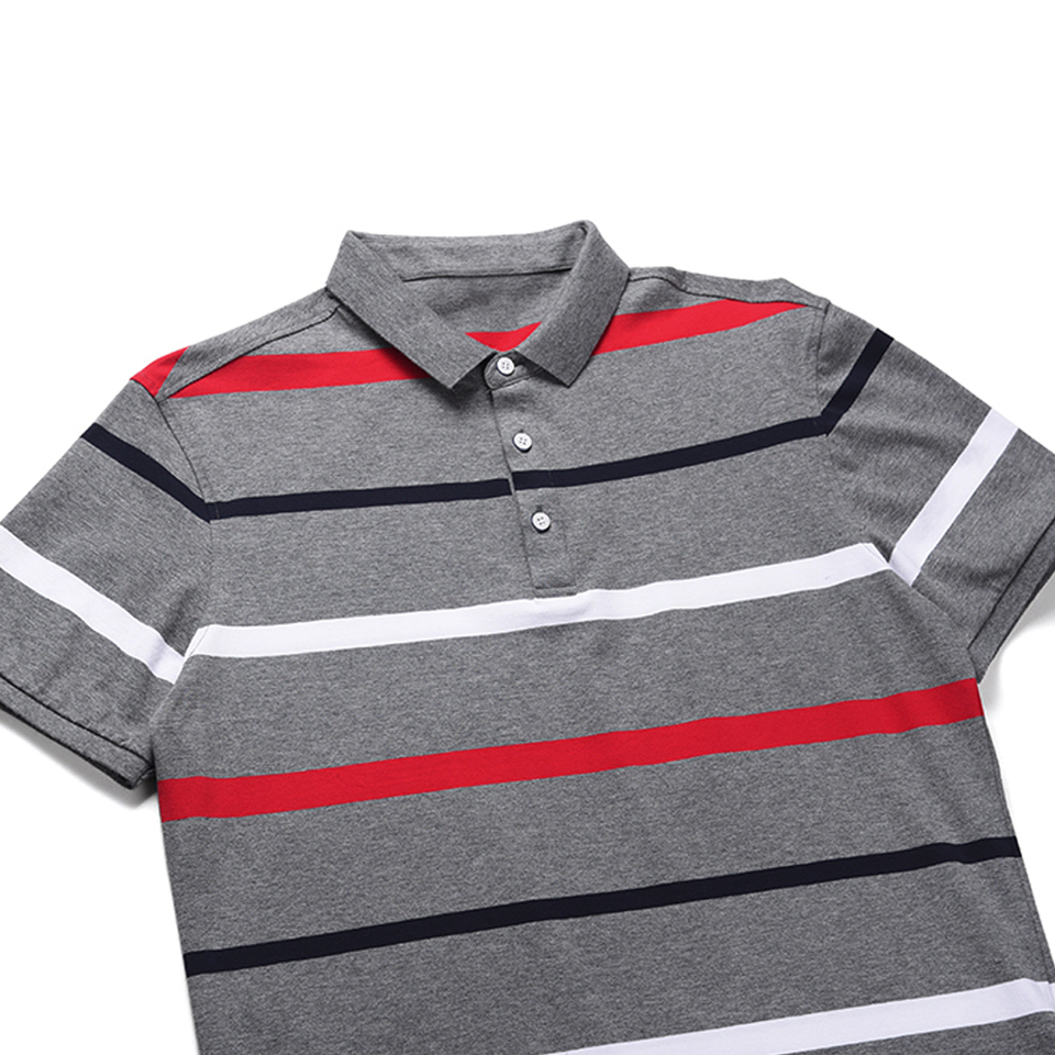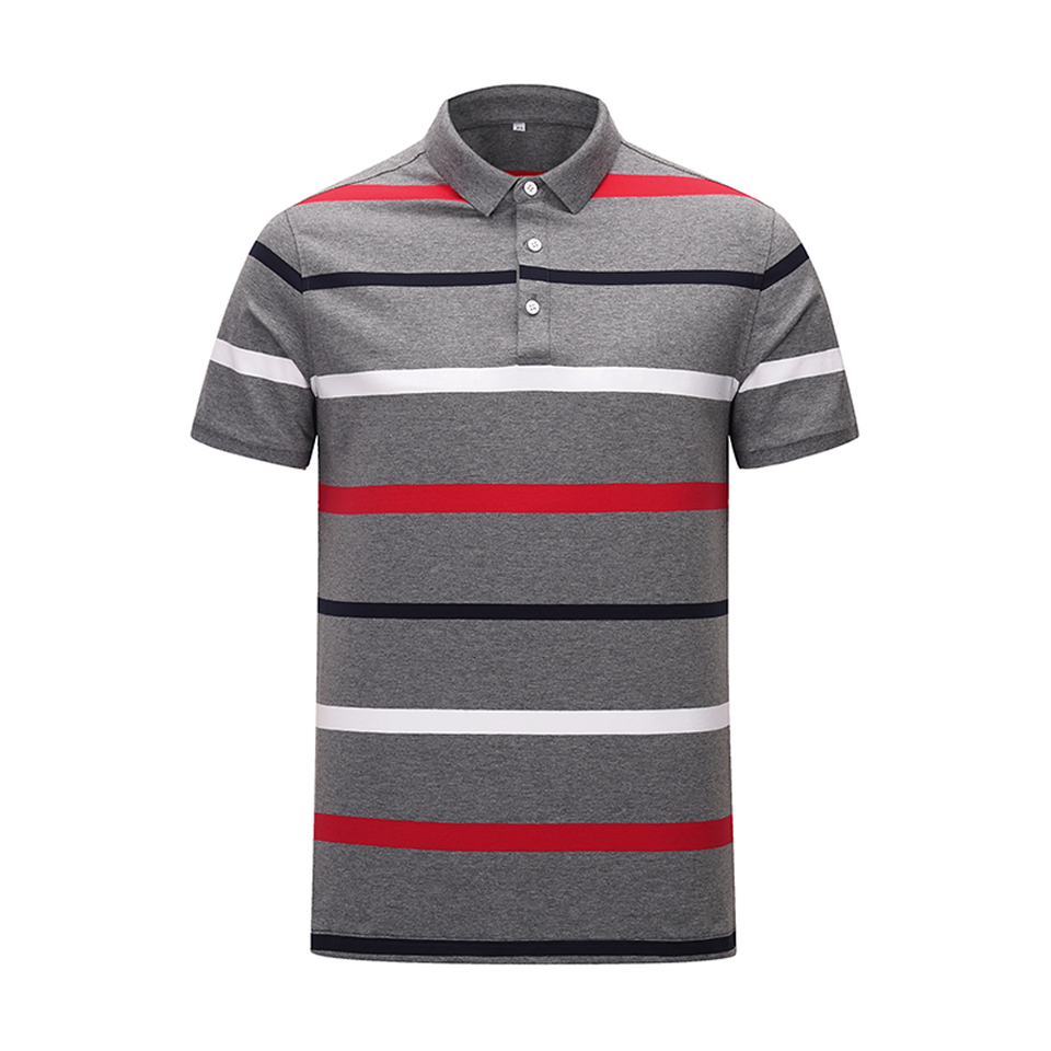 เสื้อโปโลผู้ชายลำลองสีเทา ลายทางแนวนอน ทรงเข้ารูป ผ้าฝ้าย แขนสั้น แฟชั่นลายทางสีแดงขาว เสื้อยืดใส่หน้าร้อน