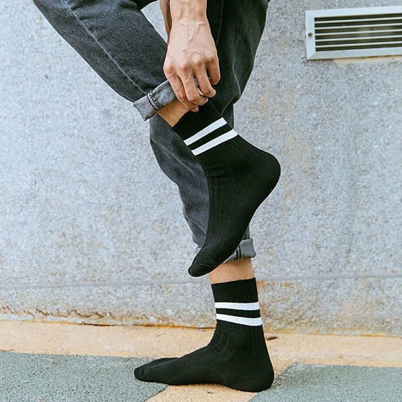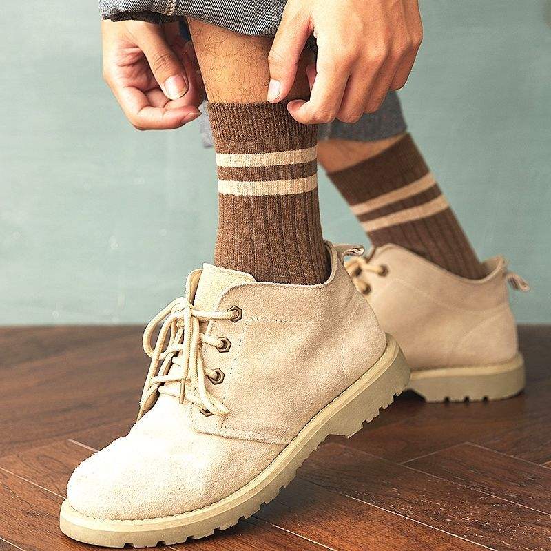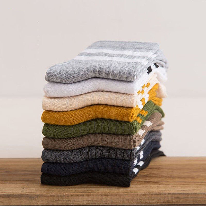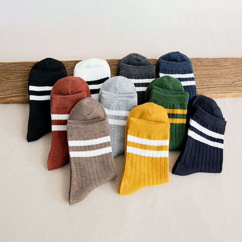 ถุงเท้าลายทางลำลองสำหรับผู้ชาย ระดับกลางน่อง ระบายอากาศได้ดี ถักทอ ใช้ได้ทุกฤดู เหมาะสำหรับใส่ทำงาน มีหลายสี