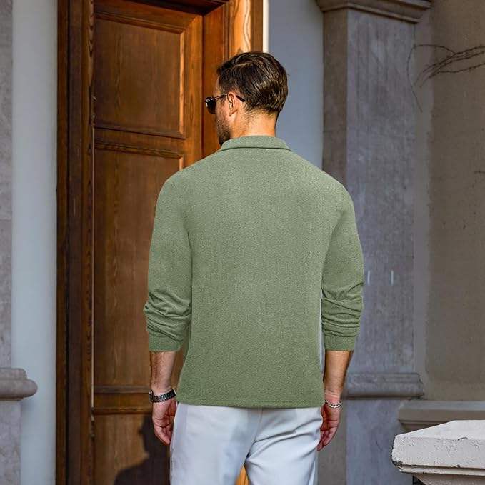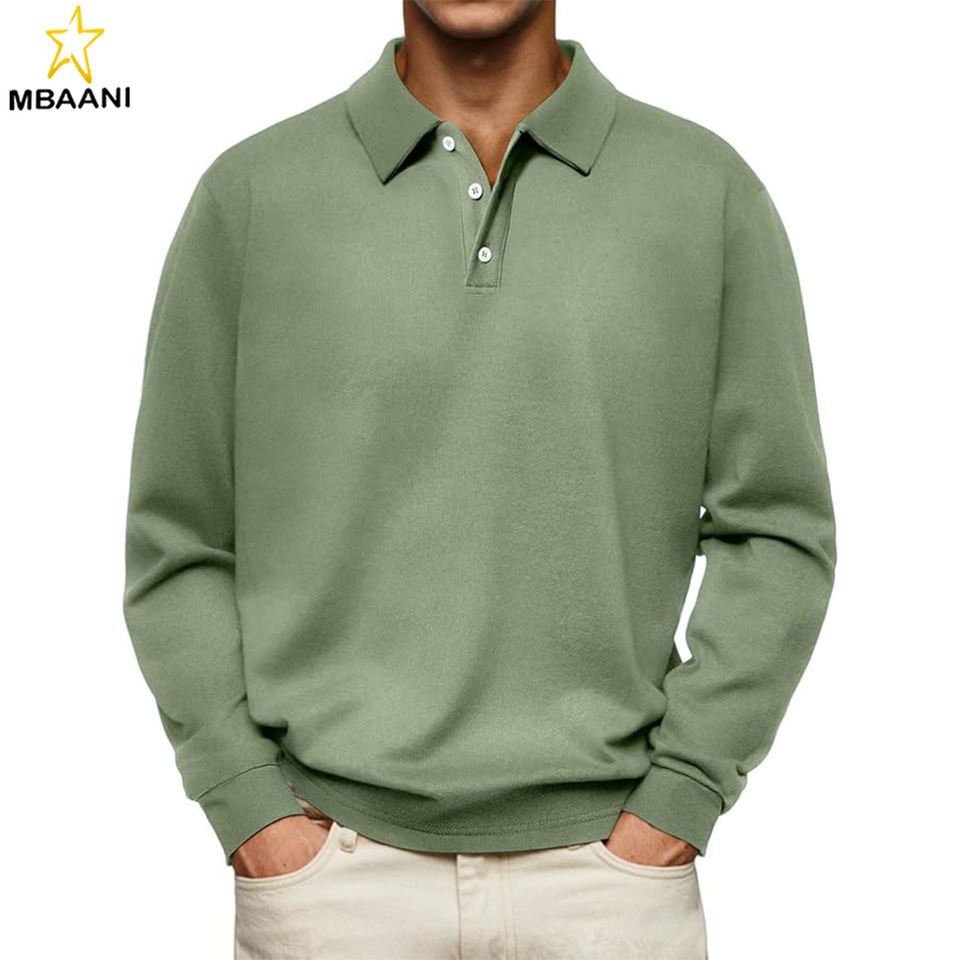 เสื้อโปโลแขนยาวลำลองสำหรับผู้ชาย เสื้อพูลโอเวอร์แบบคลาสสิก คอปกแบบดั้งเดิม เสื้อกอล์ฟสีพื้น