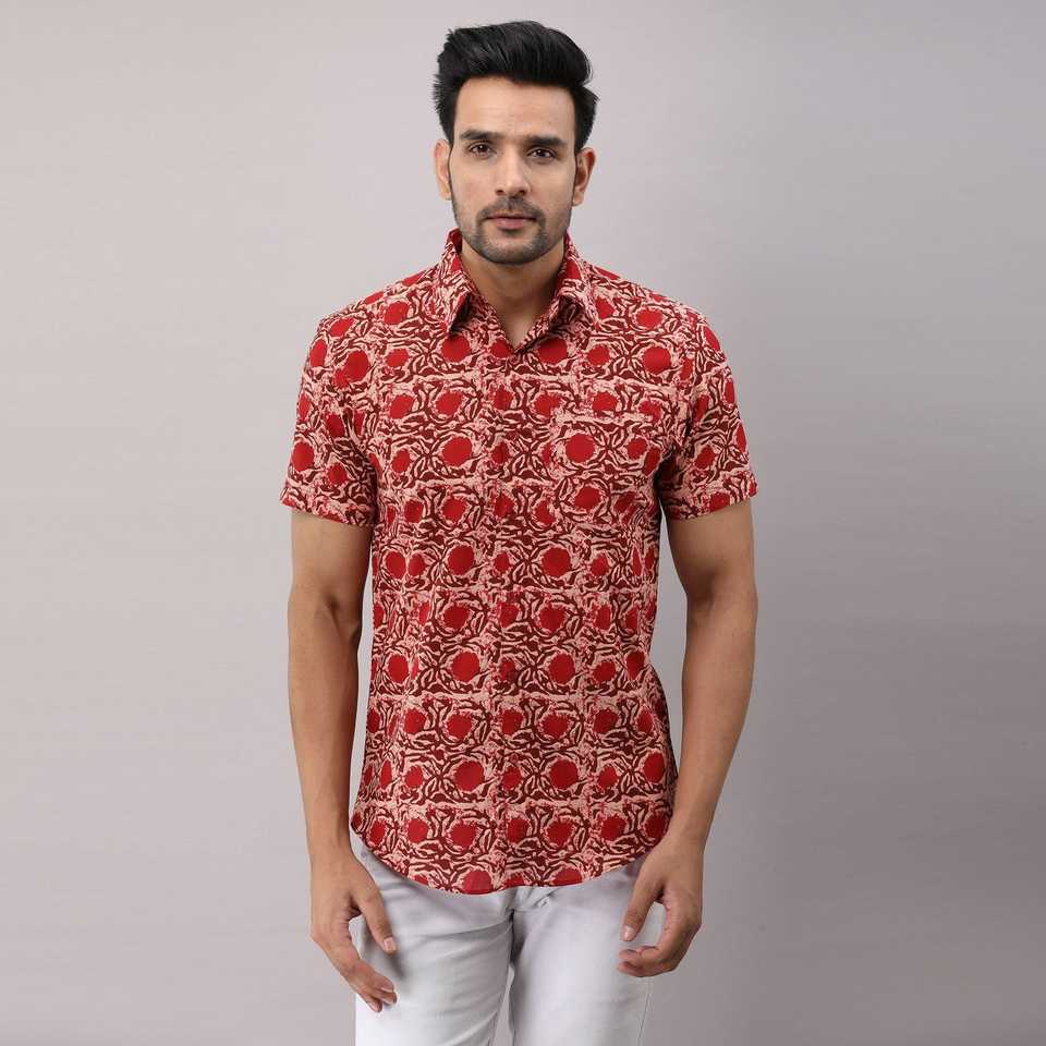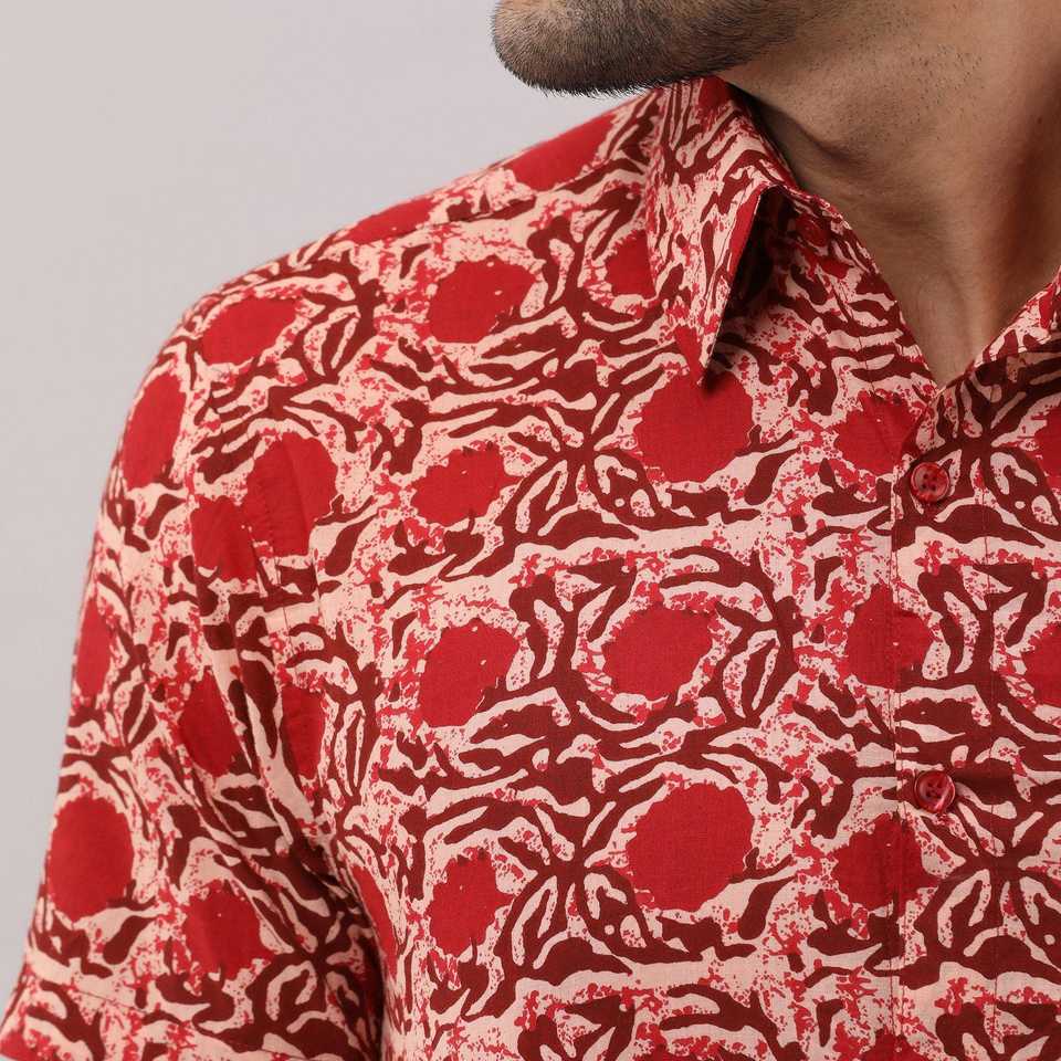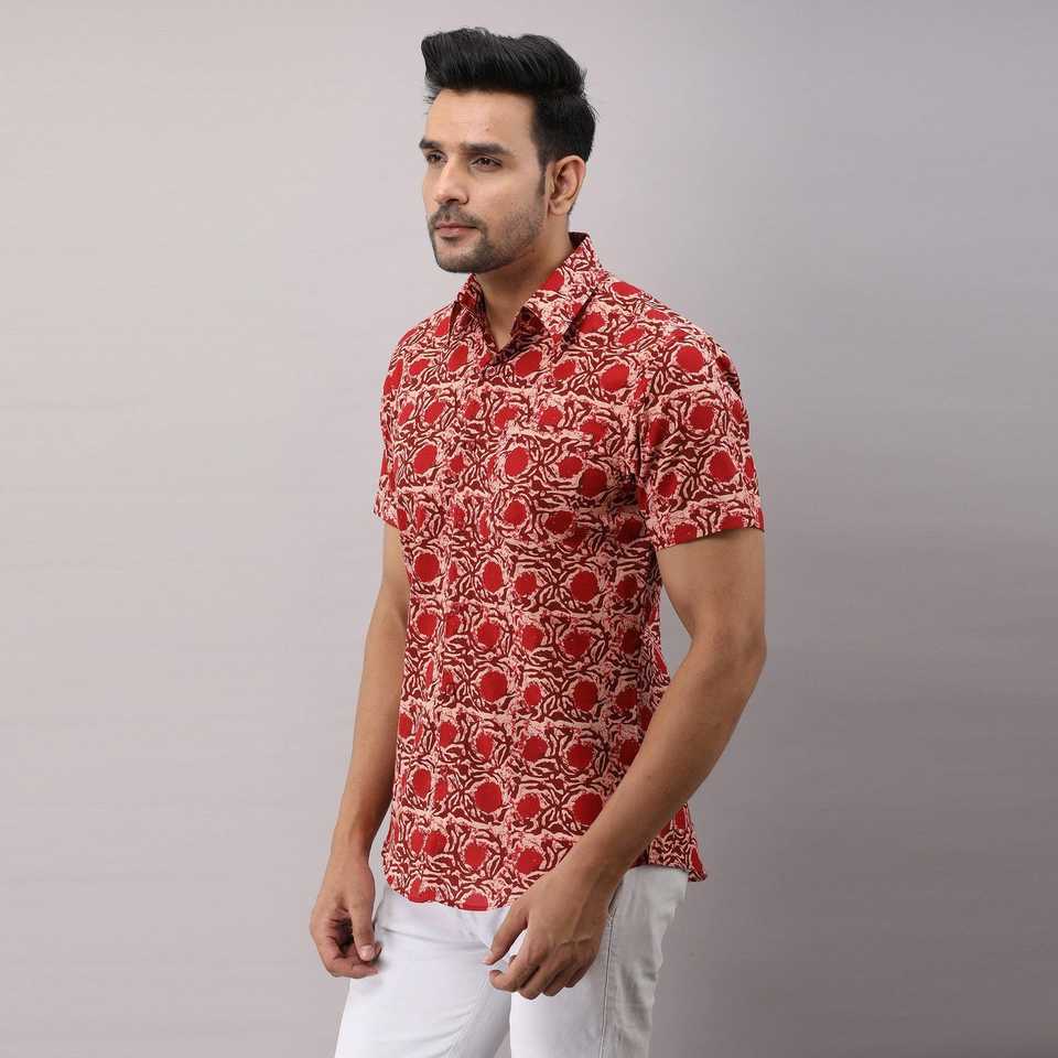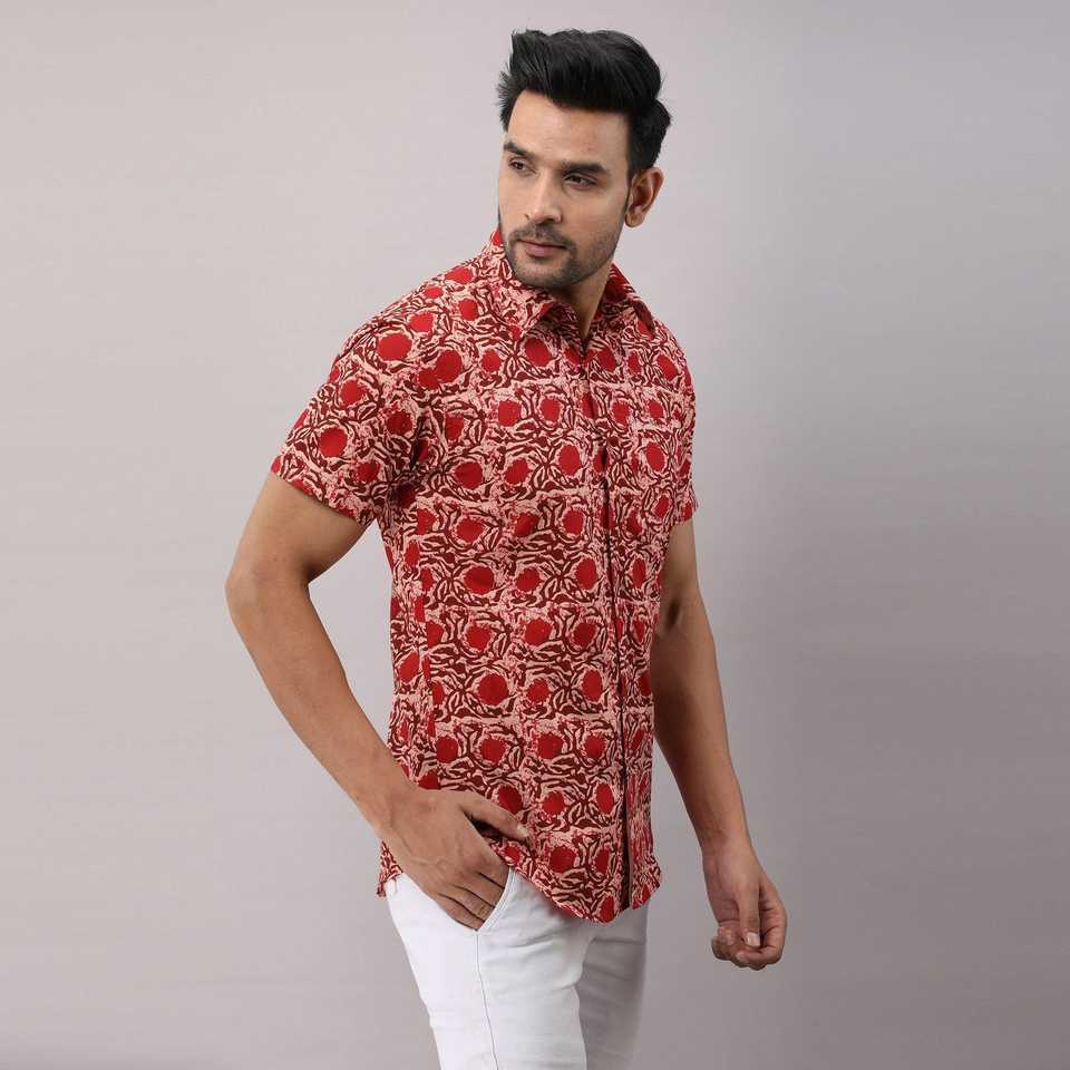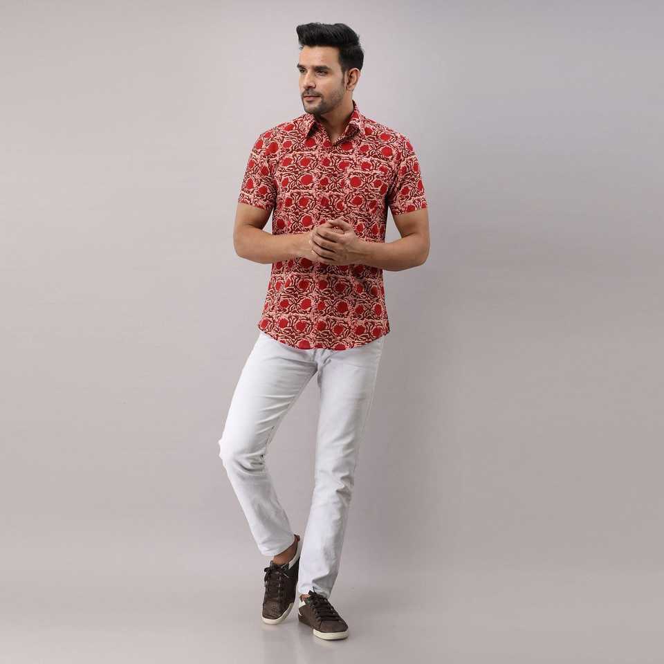 เสื้อเชิ้ตผ้าฝ้ายลายดอกไม้สีแดงลำลองของผู้ชายคอจีนกระดุมแถวเดียวสไตล์ตะวันตก3XL และ6XL