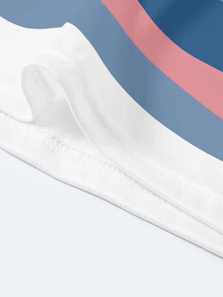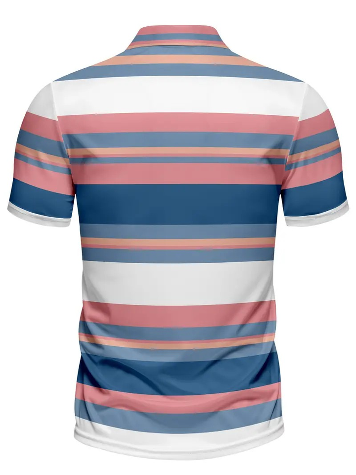 เสื้อลำลองแขนสั้นป้องกันริ้วรอยระบายอากาศได้อย่างรวดเร็วสำหรับผู้ชายเสื้อลายทางสีชมพูสีฟ้าผ้าถักโพลีเอสเตอร์พอดีตัวปกติ