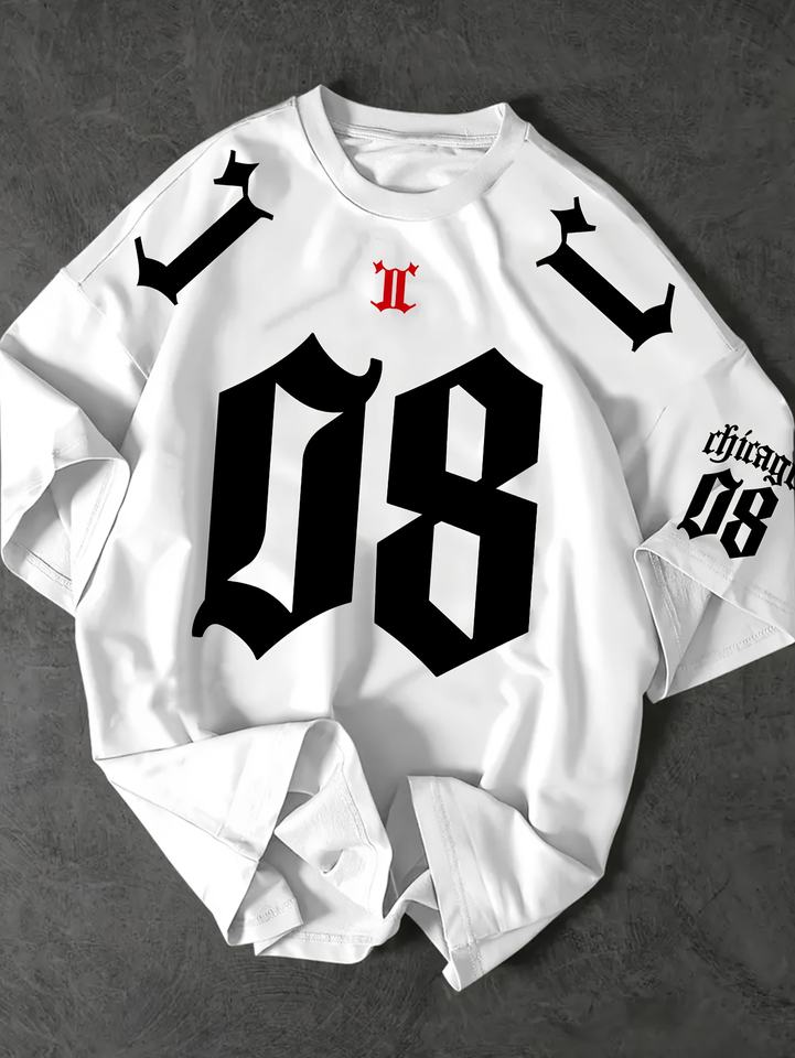 Men's Casual Streetwear Graphic T-Shirt-Black White '08' Numerals Loose Fit Drop Shoulder Digital Print Breathable Summer