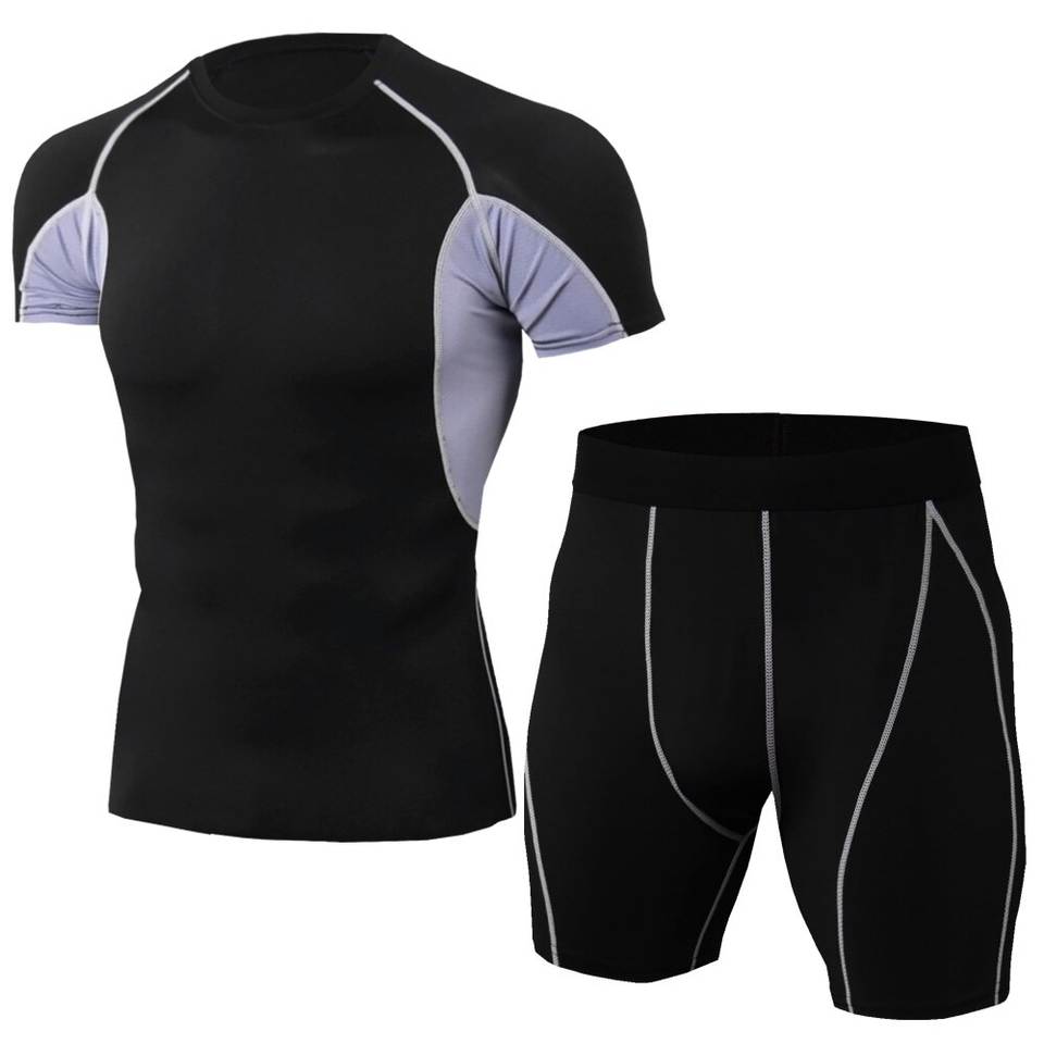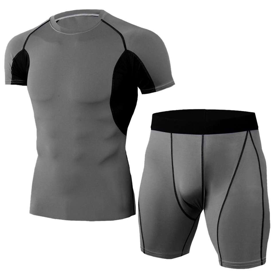 เซ็ต2ชิ้นสำหรับผู้ชายเสื้อถักแขนสั้นระบายอากาศและกางเกงขาสั้นรัดรูปสำหรับยิมออกกำลังกายและวิ่งฤดูร้อนลำลอง