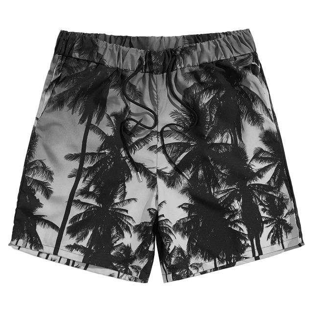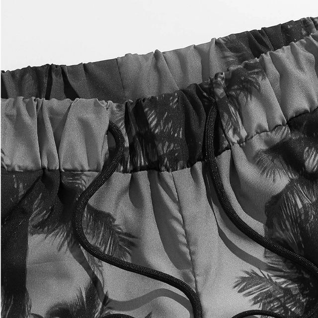 กางเกงขาสั้นชายหาดสำหรับผู้ชายกางเกงขาสั้นลำลองฤดูร้อนแบบลำลองพร้อมเชือกผูกเอวยางยืดแห้งเร็วต้นปาล์มสีม่วงและลายพระอาทิตย์ตกสำหรับผู้ชาย