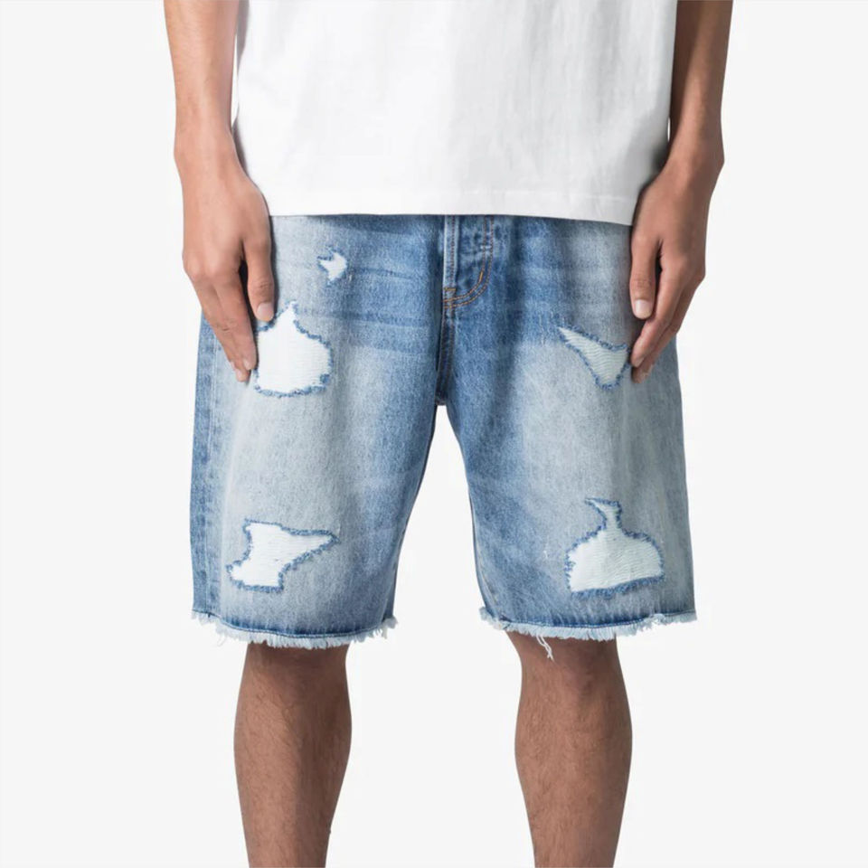 กางเกงขาสั้นผ้ายีนส์สำหรับผู้ชายแฟชั่นลำลองทรงหลวมมีชายเสื้อและกางเกงขาสั้นดีไซน์แบบขาดๆ