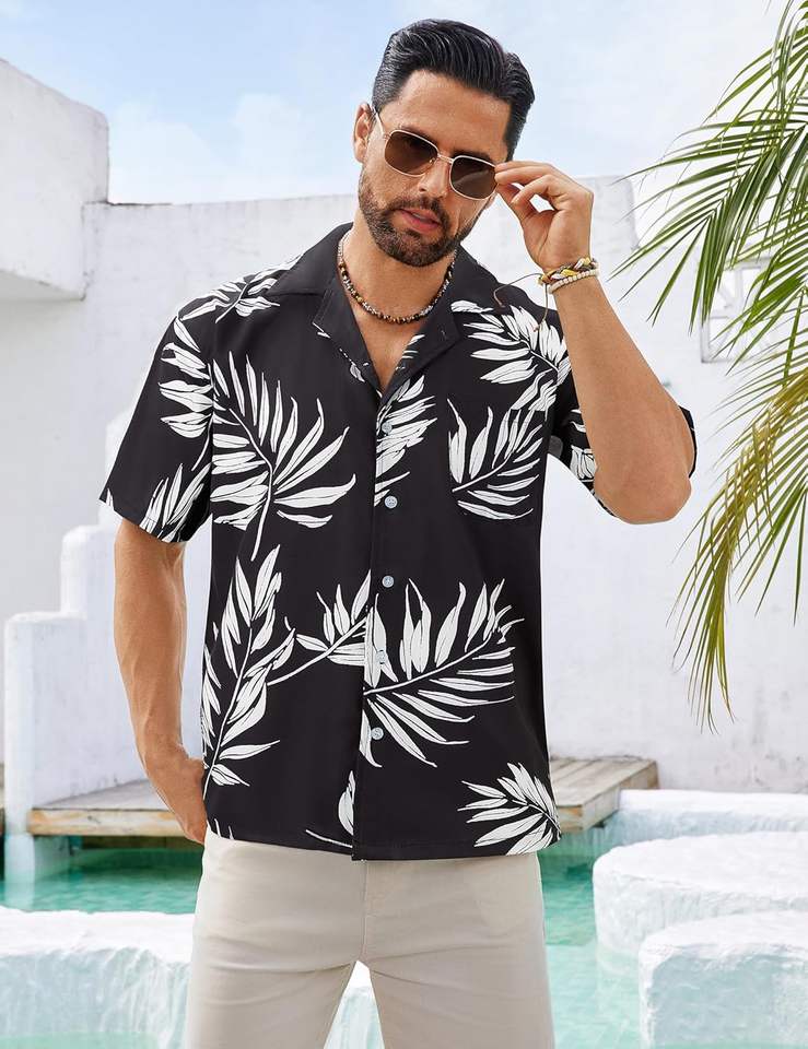 เสื้อเชิ้ตฮาวายผ้าซาตินสำหรับผู้ชายแขนสั้นมีกระดุมพิมพ์ลายดอกไม้เขตร้อนสไตล์ชายหาดลำลองฤดูร้อน