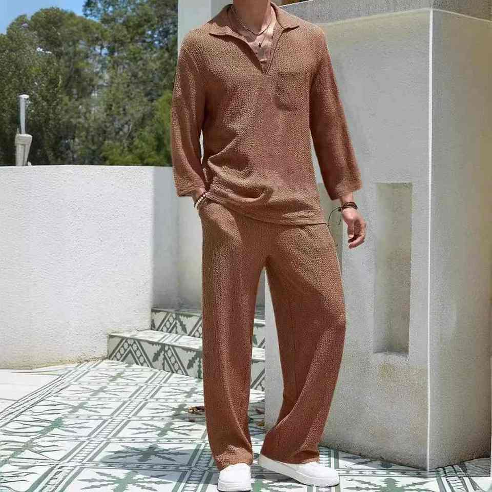 ชุดเสื้อโปโลคอวีสองชิ้นลำลองของผู้ชายสำหรับฤดูใบไม้ผลิฤดูร้อนกางเกงผ้าซาตินยาวใน PCS-R-262พิมพ์ลายระลอกน้ำ