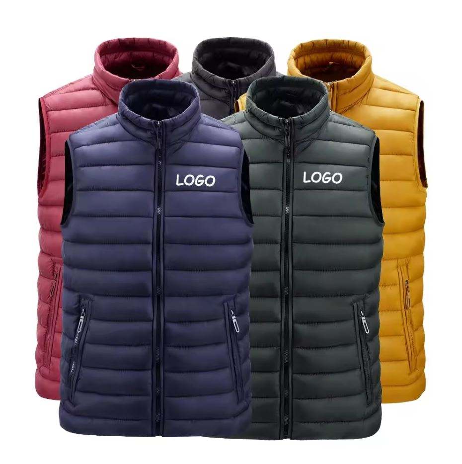 เสื้อกั๊กผู้ชายแบบลำลองกันลมสำหรับฤดูหนาว แบบไม่มีแขน ดีไซน์สีตัดต่อ ทรงพัฟเฟอร์ คอตั้ง ปิดซิป เหมาะสำหรับกิจกรรมกลางแจ้ง