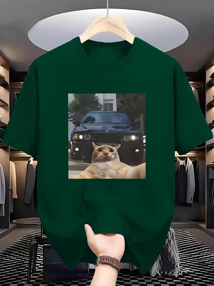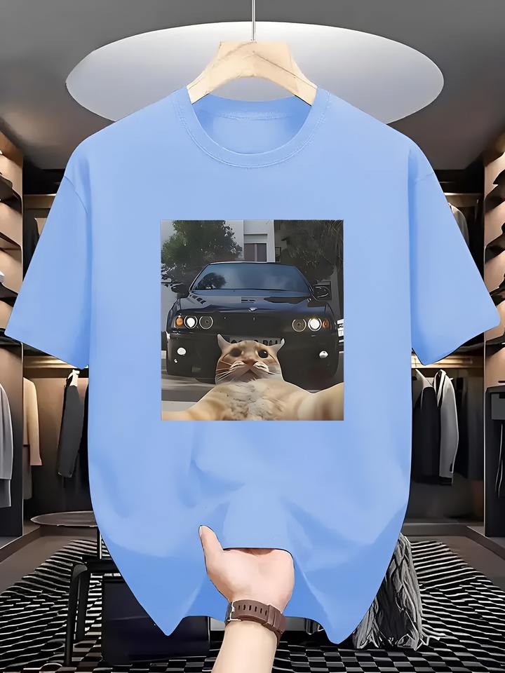 เสื้อยืดกราฟิกมีมไวรัล 'Cat Vs Muscle Car' สำหรับผู้ชาย สีดำ ทรงโอเวอร์ไซส์ แขนสั้น