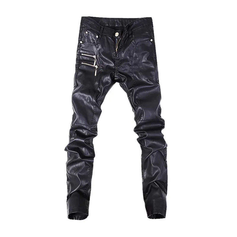 กางเกงหนังพอดีตัวลำลองสำหรับผู้ชายกางเกงยีนส์สกินนี่มีซิประบายอากาศได้กางเกงหนังไซส์ใหญ่พิเศษกางเกงกันยับ