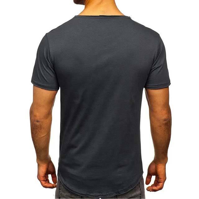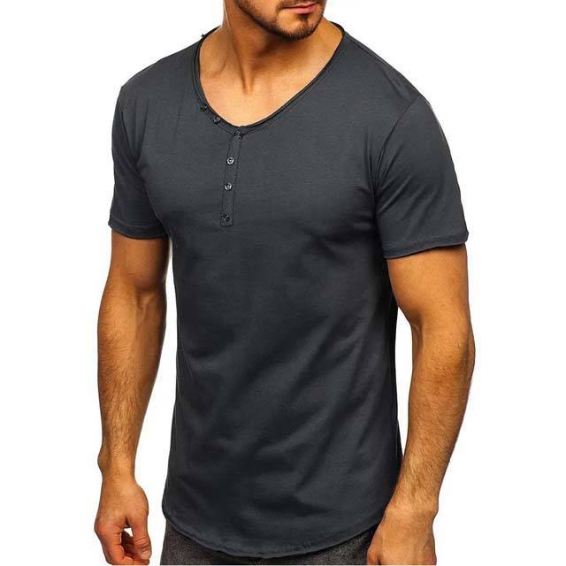 เสื้อยืดคอกลมผู้ชายสีเทาชาร์โคล ทรงวีลึก แต่งกระดุมสีขาว ผ้าฝ้าย 100% ป้องกันขนร่วง แห้งเร็ว