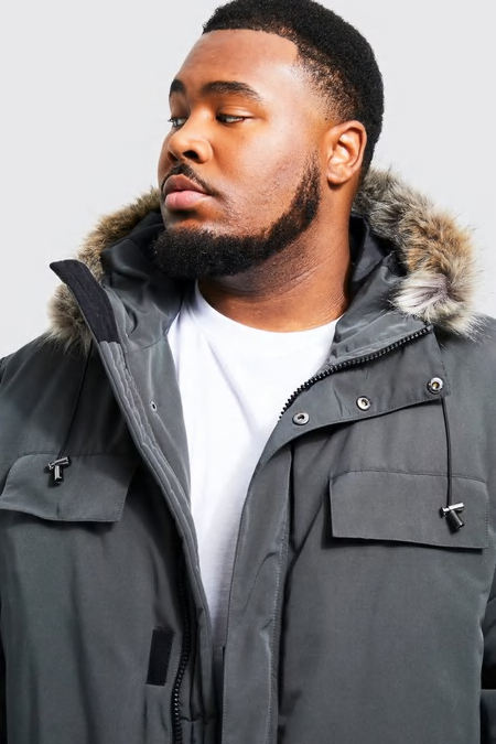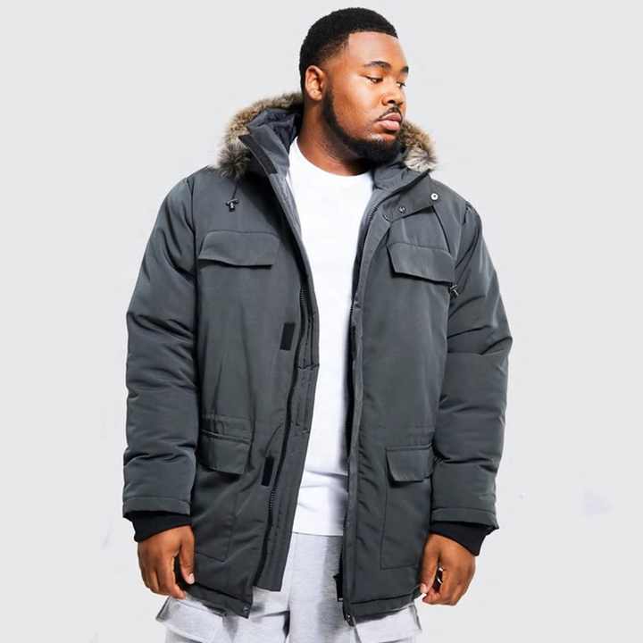 เสื้อแจ็กเก็ตผ้าคอตปาร์กาอาร์กติกมีฮู้ดขนเทียมสีเทาขนเฟอร์เนื้อผ้าระบายอากาศได้ดีสำหรับผู้ชายในฤดูหนาว