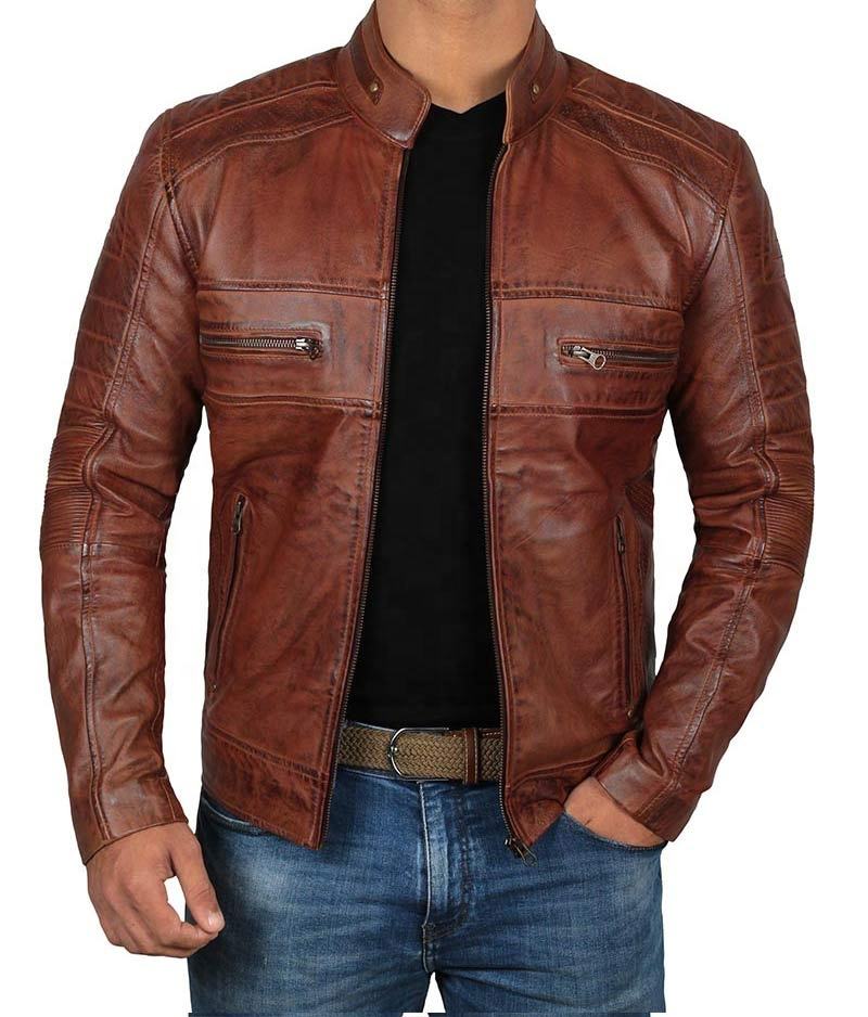 เสื้อแจ็คเก็ตหนังแท้สีน้ำตาลช็อกโกแลตสำหรับผู้ชาย ทำจากหนังแกะแท้ สามารถปรับแต่งได้เต็มที่