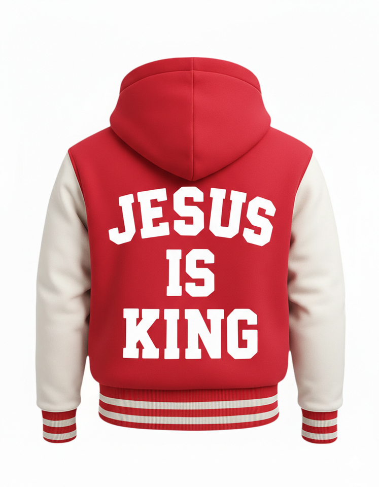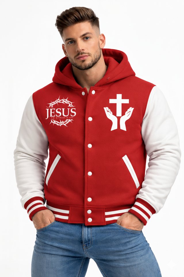 เสื้อแจ็คเก็ตวาร์ซิตี้ผู้ชายลาย "พระเยซู" มงกุฎหนามและไม้กางเขน - เสื้อฮู้ดบอมเบอร์สีแดงและสีขาวสำหรับผู้ที่รักษาศรัทธา