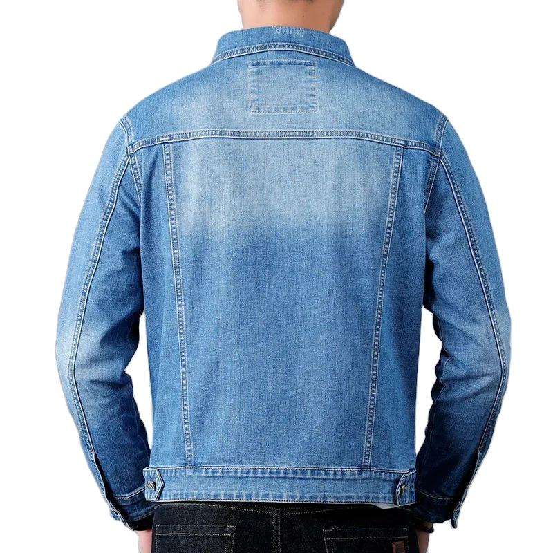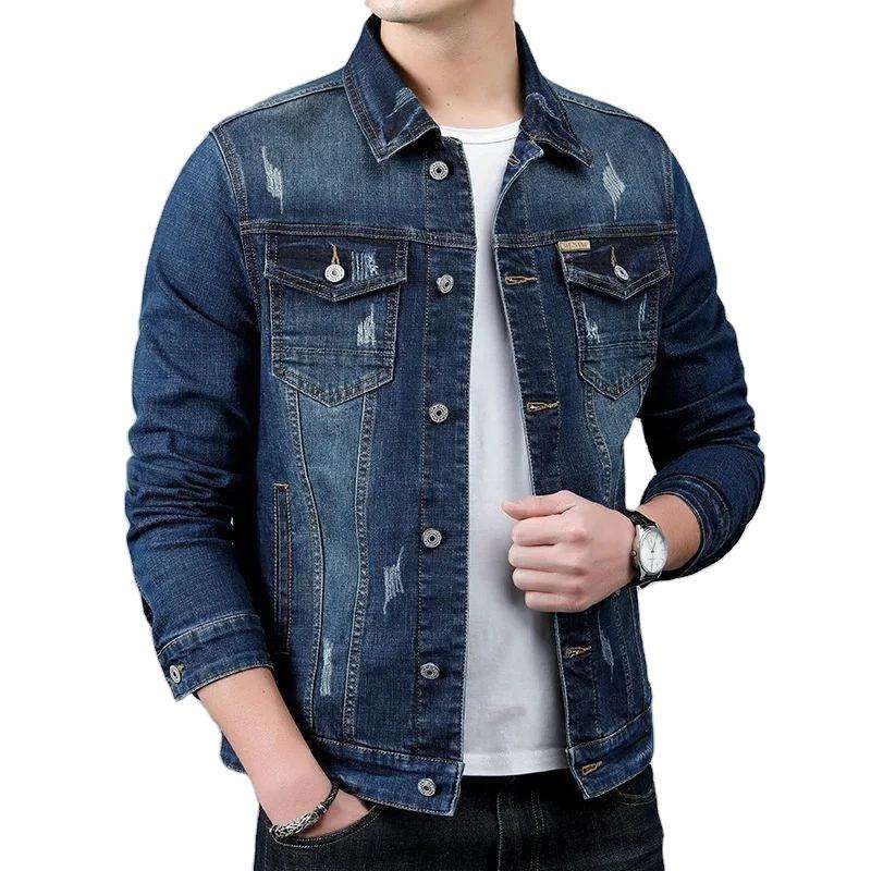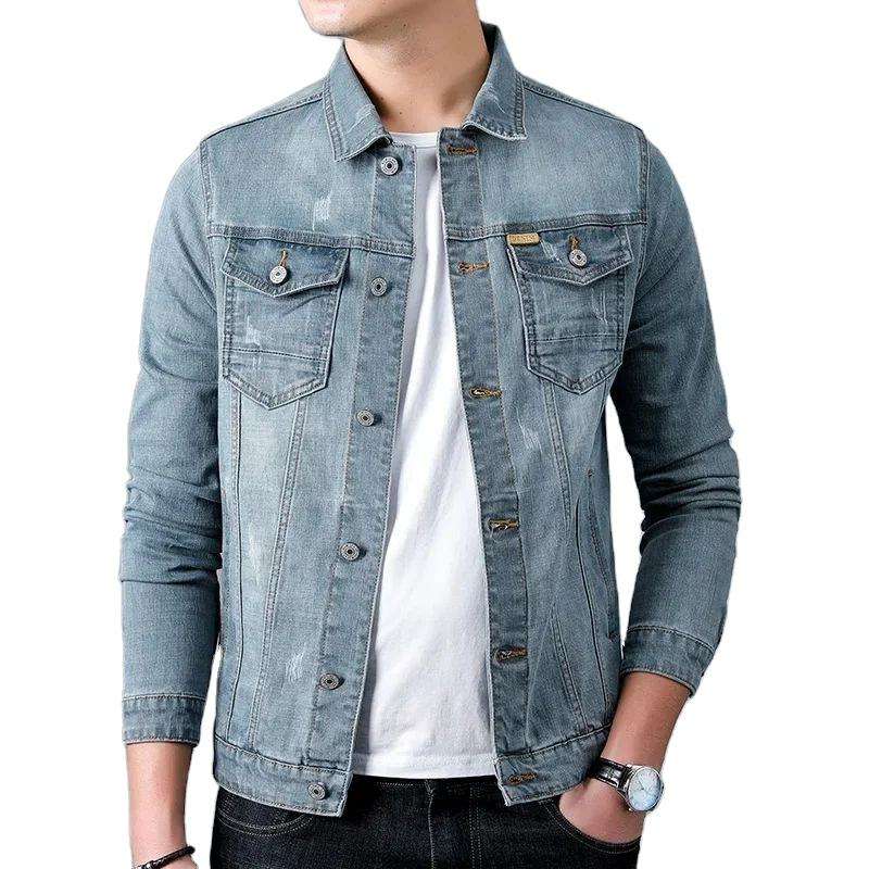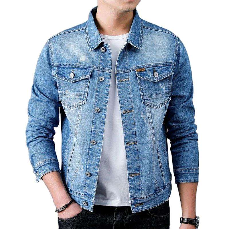 แจ็กเก็ตผ้ายีนส์ลำลองสไตล์คลาสสิกของผู้ชายเสื้อคลุมยีนส์สีน้ำเงินย้อนยุคซักใหม่ฤดูใบไม้ผลิ