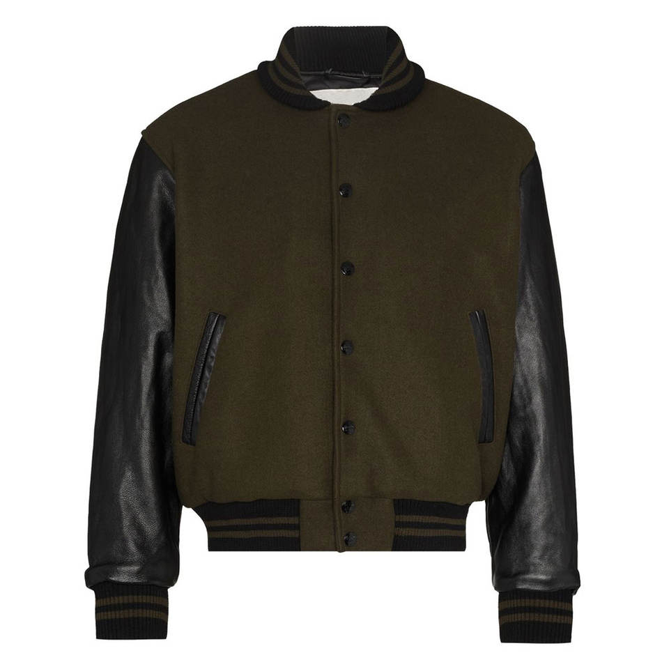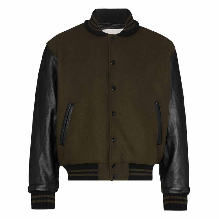 เสื้อแจ็คเก็ตขนสัตว์สไตล์วาร์ซิตี้คลาสสิกสำหรับผู้ชาย แขนหนัง คอตั้ง ดีไซน์เลตเตอร์แมนสำหรับฤดูหนาว