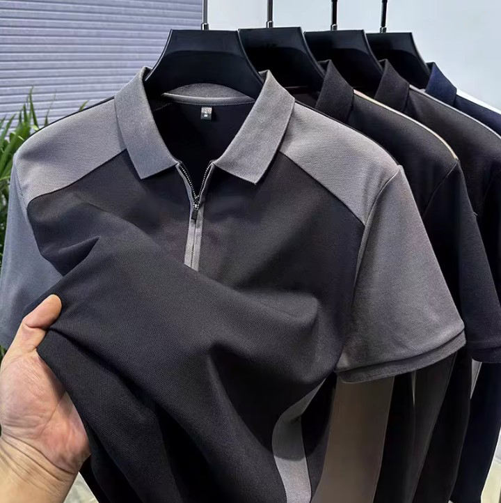 เสื้อโปโลคอปกสีบล็อกสีอินเทรนด์สำหรับผู้ชายเสื้อโปโลแขนสั้นกีฬากางเกงขาสั้นลำลองสำหรับฤดูร้อน