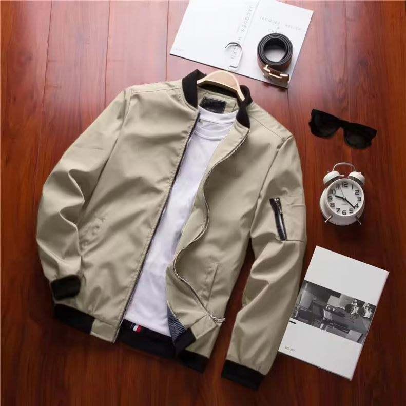 เสื้อแจ็คเก็ตบอมเบอร์ผู้ชาย ทรงหลวม คอตั้ง ปักโลโก้ด้านหน้า แขนยาว ผ้าบาง ซิปหน้า ป้องกันลม สไตล์เบสบอล