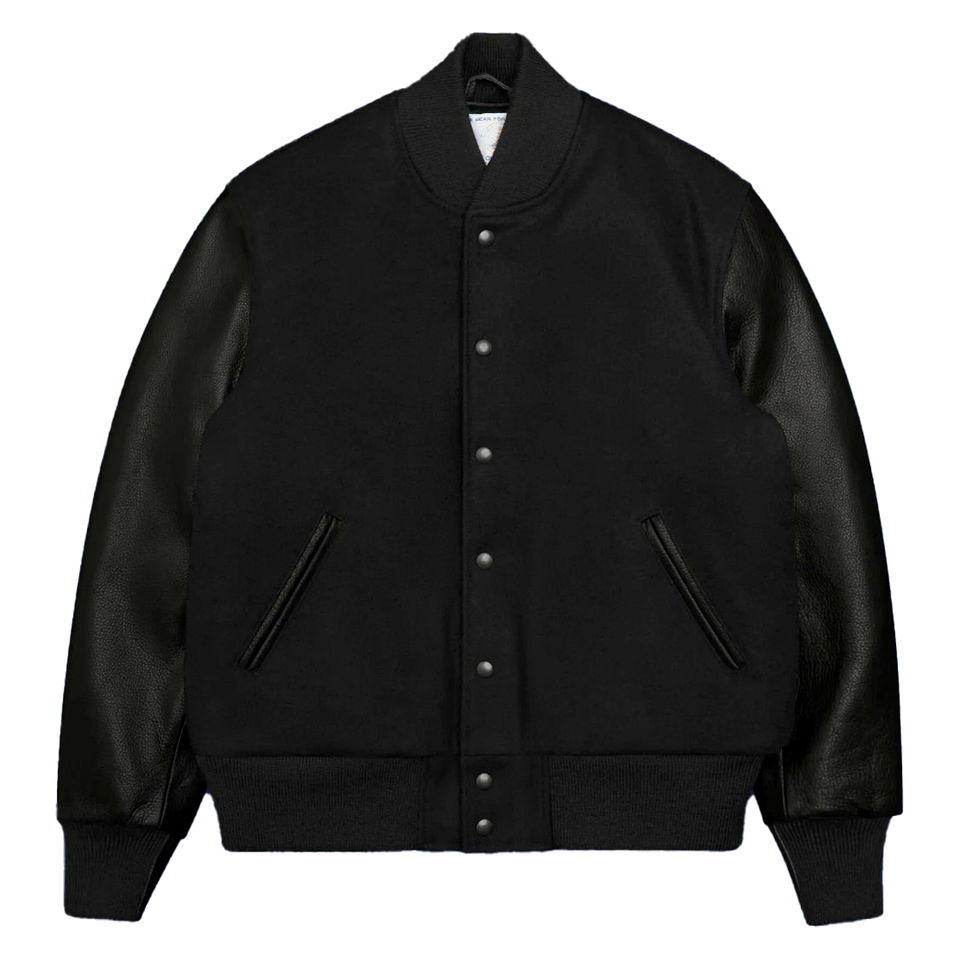 แจ็คเก็ตวาร์ซิตี้สไตล์นักศึกษาชาย ทรงคลาสสิก สีดำ ผ้าเมลตันวูล แขนหนัง พร้อมโลโก้สั่งทำ คุณภาพสูง แจ็คเก็ตยาวบาง