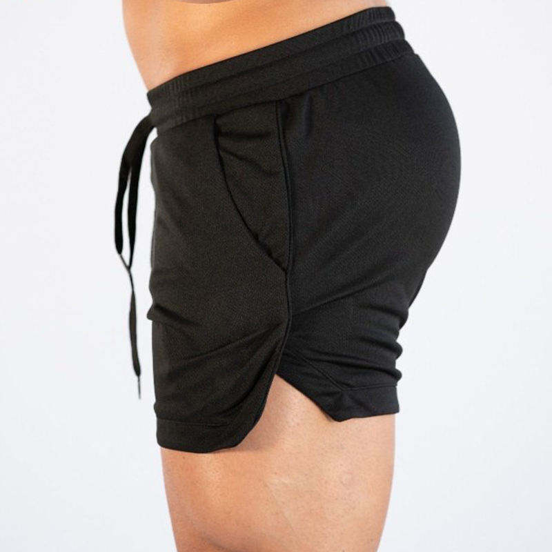 กางเกงขาสั้นรัดกล้ามเนื้อเอวสูงสำหรับผู้ชายกางเกงออกกำลังกายในยิมกันน้ำสีพื้นยืดหยุ่นมีกระเป๋าสำหรับวิ่งกีฬา