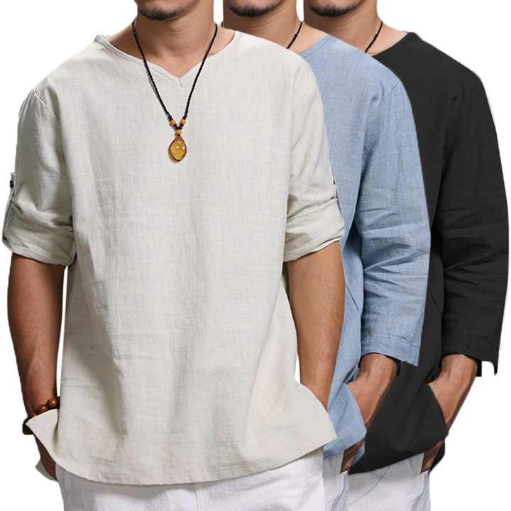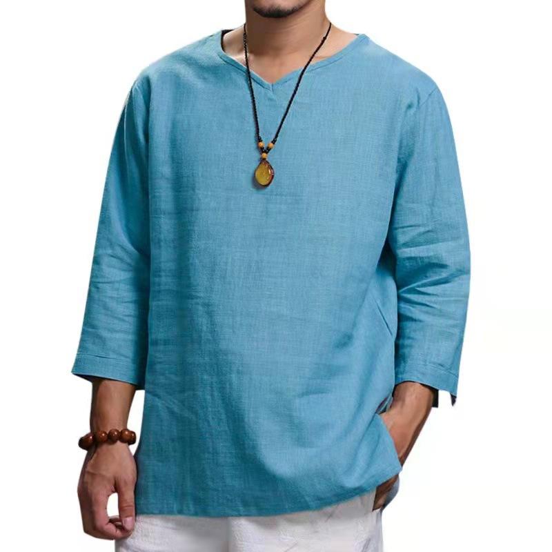 เสื้อเชิ้ตแขนยาวผ้าลินินผู้ชาย, เสื้อยืดเดินชายหาดสไตล์ฮิปปี้ลำลองเสื้อคอวี