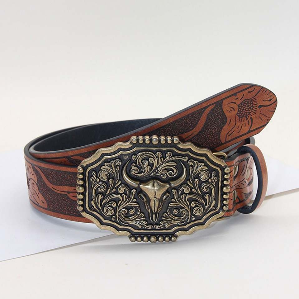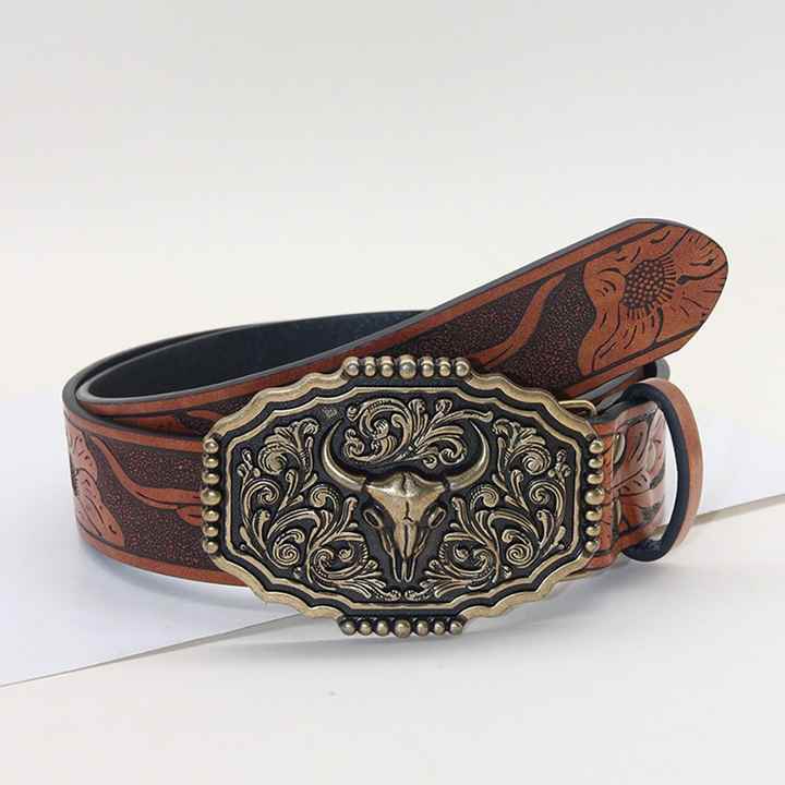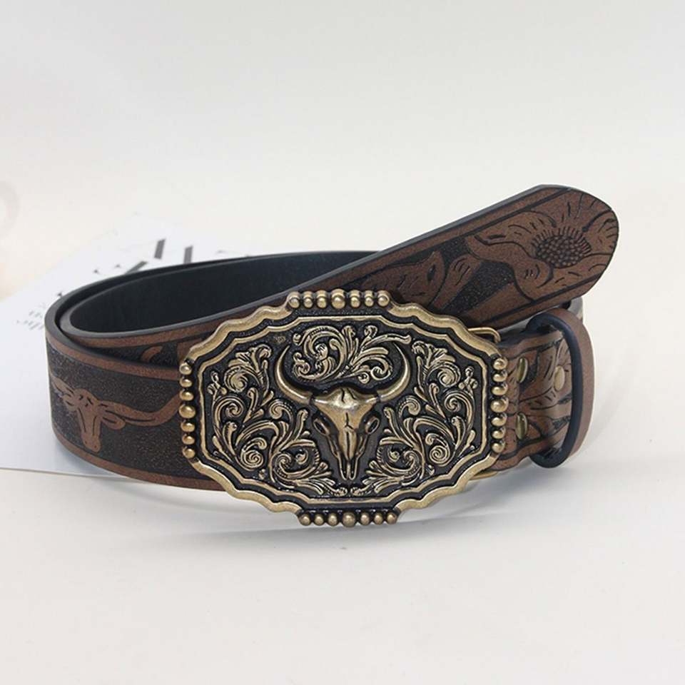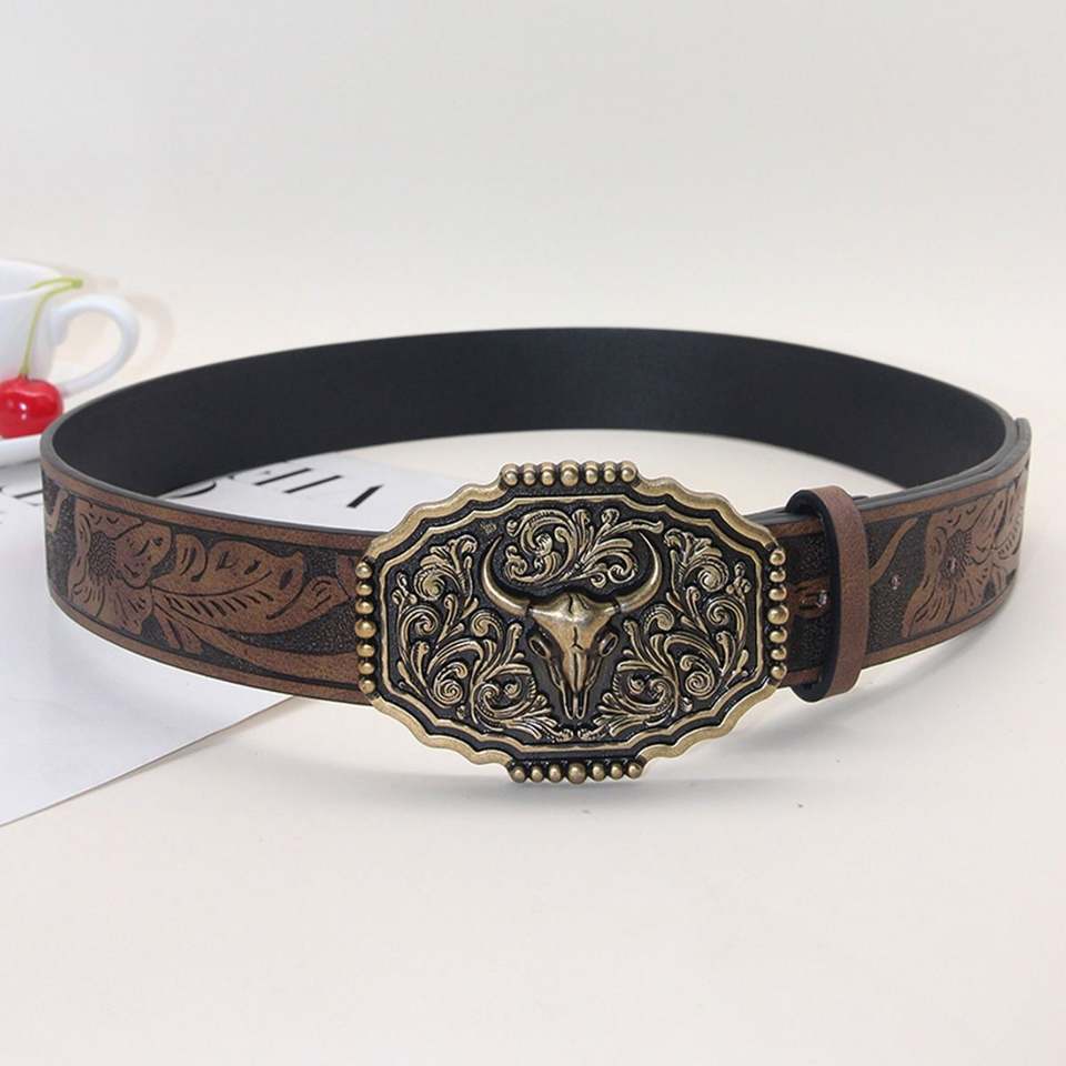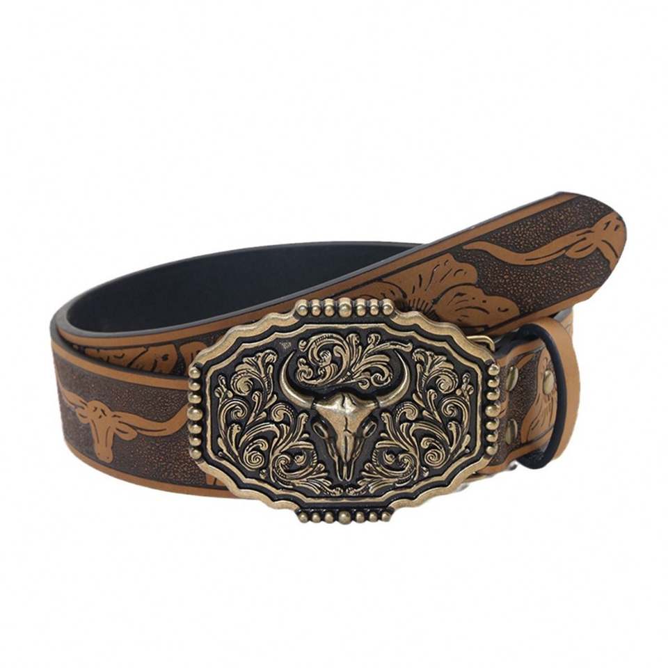 เข็มขัดผ้าเดนิมสไตล์ตะวันตกสำหรับผู้ชายเข็มขัดสไตล์วินเทจสุดหรูหัวเข็มขัดอัลลอยนูนหนัง PU ทันสมัยปรับขนาดได้