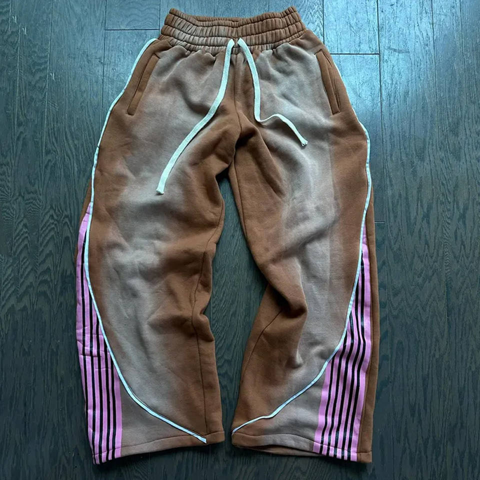 กางเกงสเวตเตอร์ถักลายทางโค้งสำหรับผู้ชายกางเกงวอร์มลำลองกางเกงวอร์มผ้าฝ้ายทรงแบ็กกี้กางเกงลายทางออกแบบได้ตามต้องการสำหรับผู้ชาย